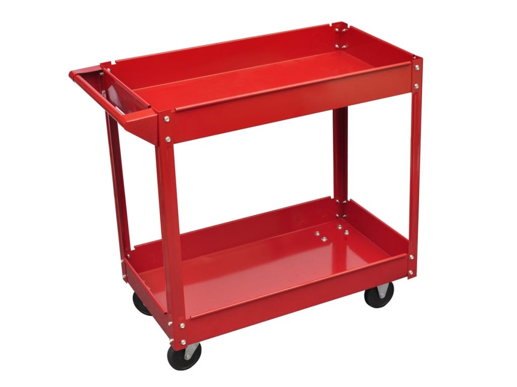 Tento dielenský vozík na náradie má robustnú konštrukciu s 2 poličkami s nosnosťou maximálne 100 kg. Dielenský vozík vám umožní jednoducho a bezpečne skladovať a prepravovať náradie v garáži či v dielni. Má lakovanú oceľovú konštrukciu. Všetky 4 kolieska sú otočné. Vozík má praktickú rúčku, pomocou ktorej ho môžete tlačiť.
