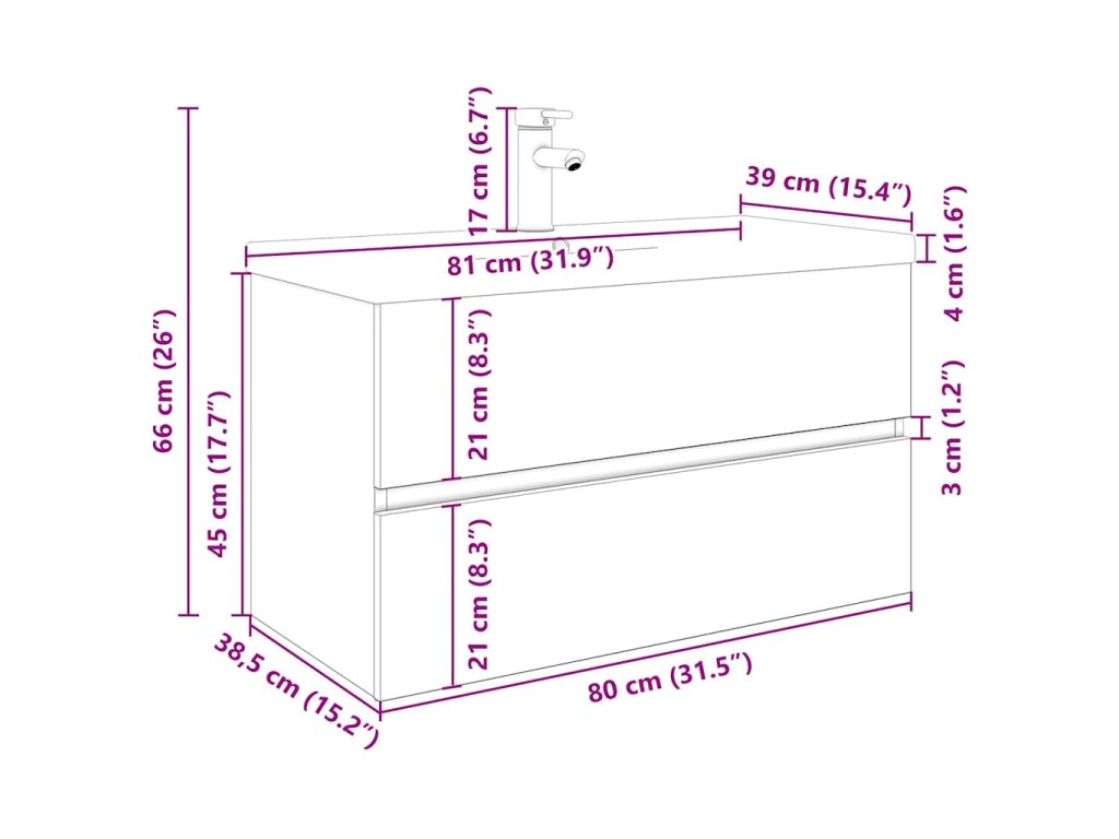 - Rozmery umývadla: 81 x 39 x 18 cm (D x Š x V)