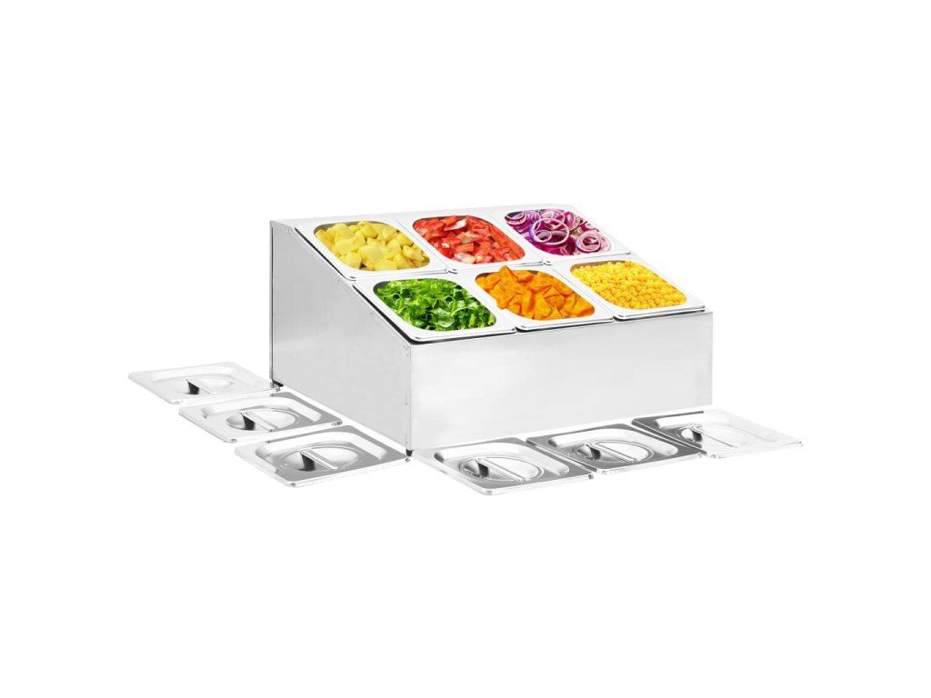 Táto nadstavba, vyrobená z nehrdzavejúcej ocele, je vhodná do umývačky riadu a ľahko sa čistí. Protišmykové gumené nožičky zaručujú stabilitu a chránia pracovnú plochu pred poškriabaním. Obsahuje aj 6 nádob GN 1/6, ktoré je možné odobrať pre ľahké plnenie a vyprázdňovanie. V balení sa nachádzajú aj zodpovedajúce viečka, aby bol obsah čerstvý, bezpečný a aby do neho nalietaval hmyz.