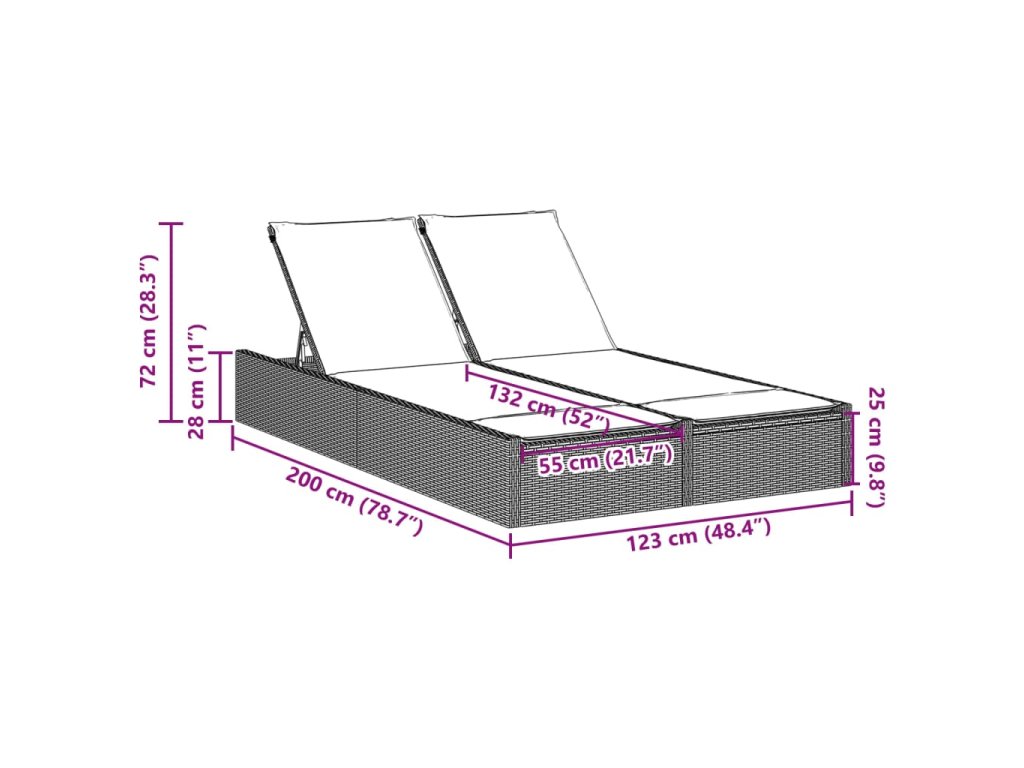 - Rozmery: 123 x 200 x 28/46/61/72 cm (Š x H x V)
