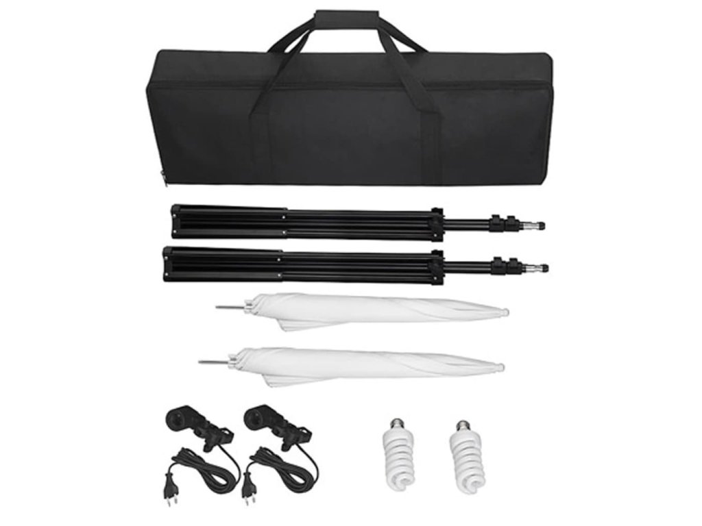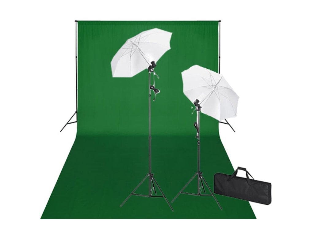 Táto súprava poskytuje kompletný systém na upevnenie fotopozadia a extra široké fotopozadie zelenej farby (600 x 300 cm). Ďalej v nej nájdete aj príslušenstvo na zabezpečenie osvetlenia v podobe dvoch lámp s denným svetlom a s dáždnikmi. Intenzita osvetlenia každej lampy je 24 wattov (efektívny výkon zodpovedá 100 wattom).