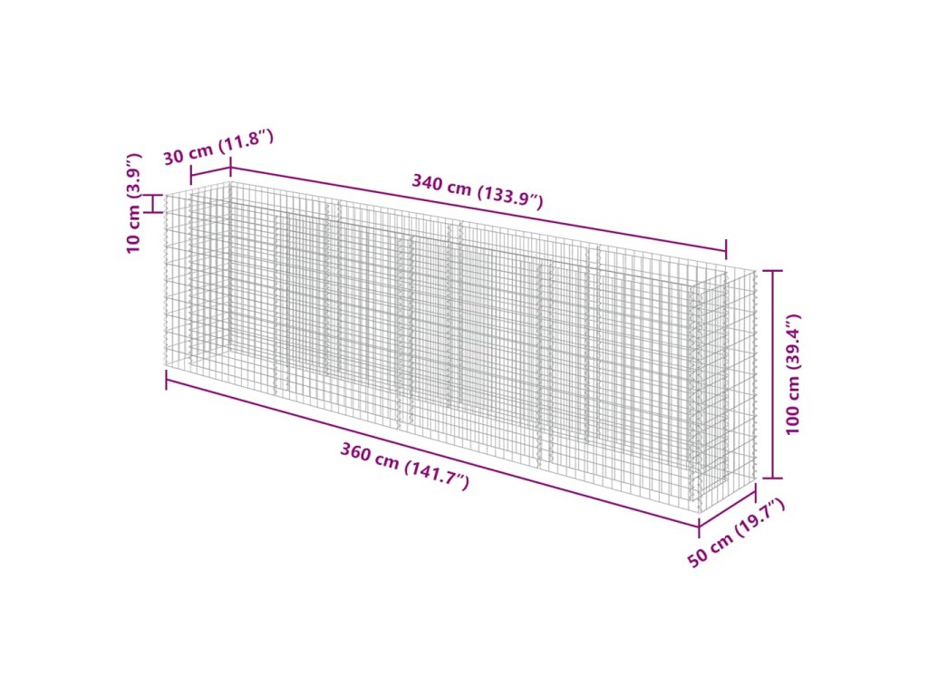 Stabilný gabión je určený na to, aby sa do neho vložili kamene alebo štrk. Gabión je vyrobený z pozinkovanej ocele, ktorá je odolná voči hrdzi a poveternostným vplyvom, vďaka čomu vytvorí veľmi stabilný a trvácny vyvýšený záhon. Mriežku tvoria priečne a pozdĺžne drôty, ktoré sú zvarené na každom prieseku pre čo najväčšiu stabilitu.