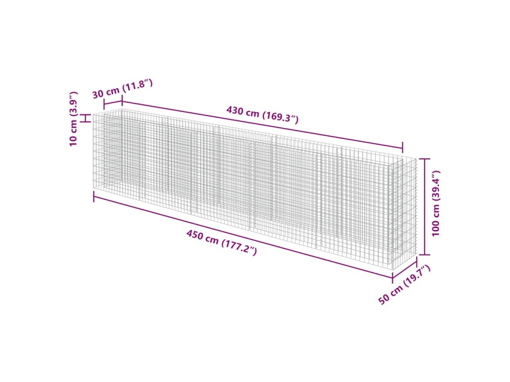 Stabilný gabión je určený na to, aby sa do neho vložili kamene alebo štrk. Gabión je vyrobený z pozinkovanej ocele, ktorá je odolná voči hrdzi a poveternostným vplyvom, vďaka čomu vytvorí veľmi stabilný a trvácny vyvýšený záhon. Mriežku tvoria priečne a pozdĺžne drôty, ktoré sú zvarené na každom prieseku pre čo najväčšiu stabilitu.