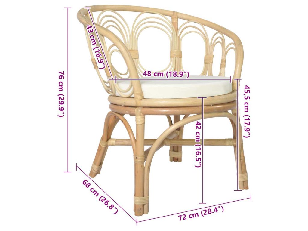 Stolička je vyrobená z prírodného ratanu, vďaka čomu je odolná a ľahko sa čistí. Mäkký vankúš vám poskytne optimálne pohodlie po náročnom dni. Jedálenská stolička má zaoblené operadlo, ktoré ponúka vynikajúcu oporu pri sedení.