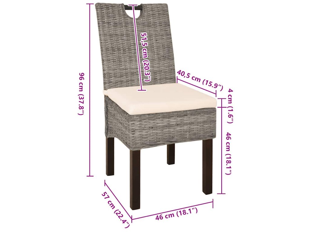 Rámy z mangového dreva a výplet z pravého ratanu dodávajú stoličkám nielen pevnosť, no taktiež aj esteticky pekné prevedenie. Ratanové sedadlá sú veľmi pohodlné a ľahko sa čistia. Hrubé sedáky sú veľmi prispôsobivé a vďaka odnímateľným povliečkam na vankúšoch sú aj umývateľné. Ak hľadáte nábytok, ktorý dotvorí zariadenie vo Vaše kuchyni alebo jedálenskej miestnosti, tieto krásne pletené stoličky Vás určite nesklamú.