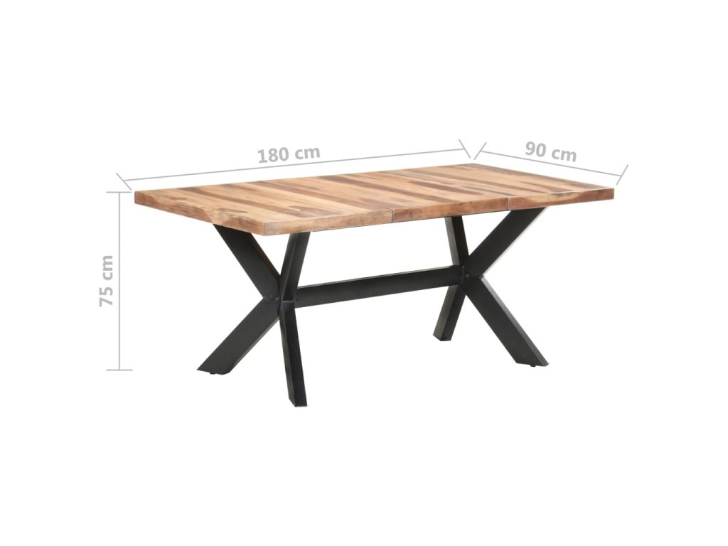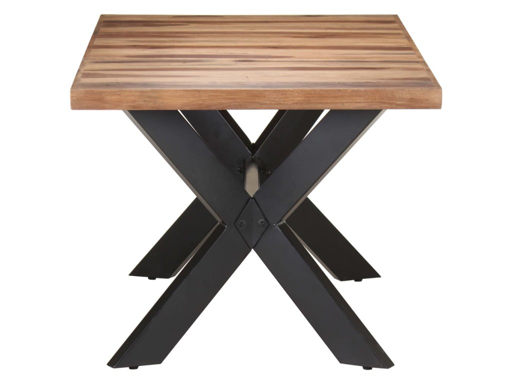 Jedálenský stôl je vyrobený z akáciového a kaučukového masívu s medovým náterom. Stolík je kompletne ručne vyrobený. Každý krok výrobného procesu sa vykonáva s maximálnou starostlivosťou, či už je to leštenie, natieranie alebo lakovanie. Oceľové nohy dotvárajú industriálny vzhľad stolíka a spolu s prekríženým oceľovým rámom vytvárajú pevnú konštrukciu.
