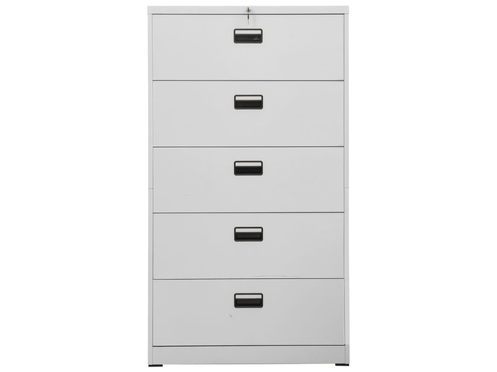 Táto kancelárska skriňa je vyrobená z ocele, takže je odolná a ľahko sa čistí. Vďaka 5 zásuvkám a zámku vám táto kartotéka umožňuje prehľadne triediť spisy do rôznych kategórií a uchovávať ich v bezpečí. Každá zásuvka je vybavená 1 odnímateľnou závesnou lištou, ktorú možno ľubovoľne kombinovať a ukladať do nej zložky listových formátov, oficiálnych formátov a A4. Zásuvky s 3 sekciami s guľôčkovými ložiskami zabezpečujú hladké otváranie a zatváranie aj pri zvýšenej záťaži. Zásuvky sa dajú úplne vysunúť.