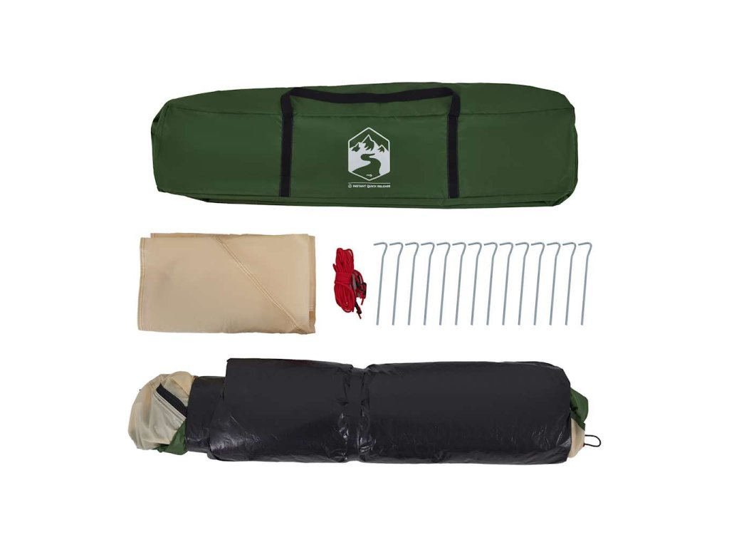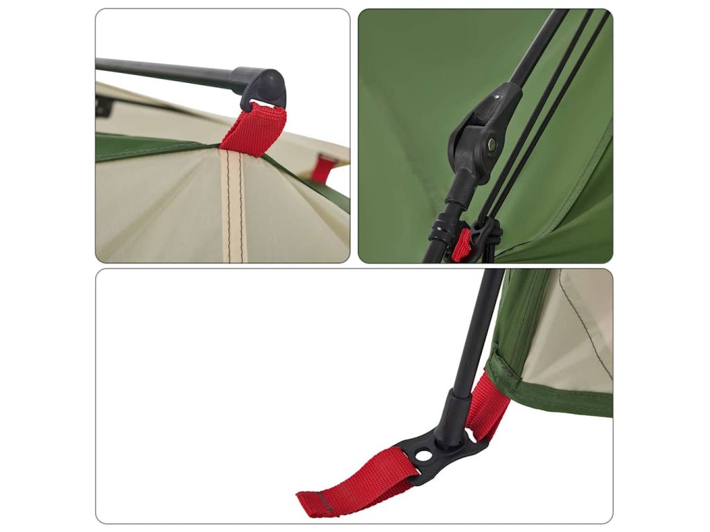 - Rýchloupínací systém: Pomocou rýchloupínacieho systému stan postavíte naozaj jednoducho! Stan položte a predĺžte vopred zmontované tyče, kým nezapadnú na miesto. Teraz je všetko pripravené!