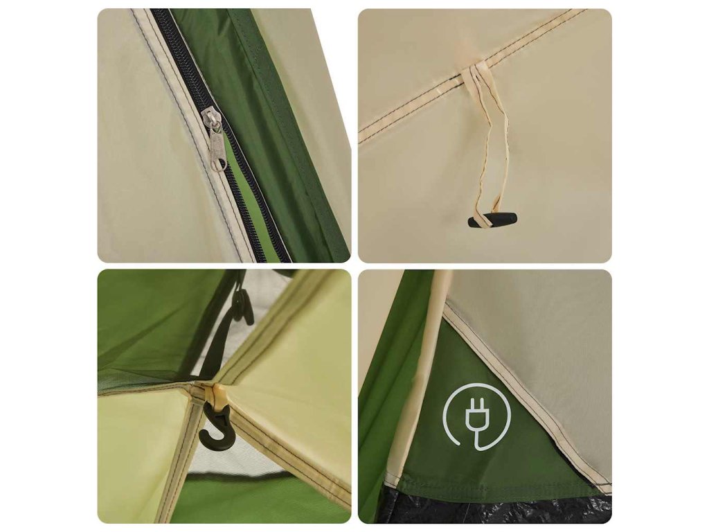 - Vodotesný dizajn: Tento kempingový stan je vyrobený z polyesteru s PU vrstvou, takže je vodeodolný a odolný voči vetru. Podlepené švy účinne zabraňujú prenikaniu dažďovej vody, zatiaľ čo odolná podlážka pomáha udržiavať interiér suchý a pohodlný.