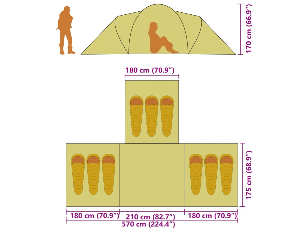 Tento veľký stan bude ideálny pre všetky vaše stanovačky! Má pohodlný interiér vhodný na kemping vonku, na cestovanie a na dovolenku v kempe. Tento stan je dostatočne veľký až pre 9 osôb. Jeho súčasťou sú tri rôzne časti, z ktorých každá ponúka dostatok priestoru pre maximálne 3 osoby.