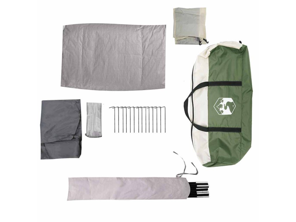 - Vodotesný dizajn: Tento kempingový stan je vyrobený z polyesteru s PU vrstvou, takže je vodeodolný a odolný voči vetru. Podlepené švy účinne zabraňujú prenikaniu dažďovej vody, zatiaľ čo odolná podlážka pomáha udržiavať interiér suchý a pohodlný.