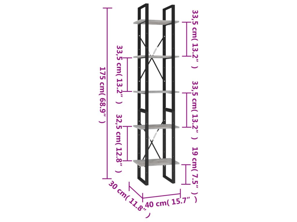 Multidom Knižnica s 5 policami, betónová 40x30x175 cm, kompozitné drevo