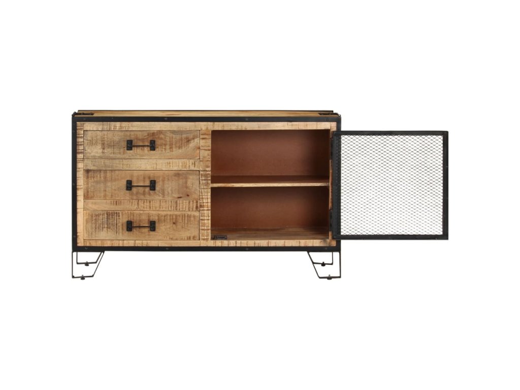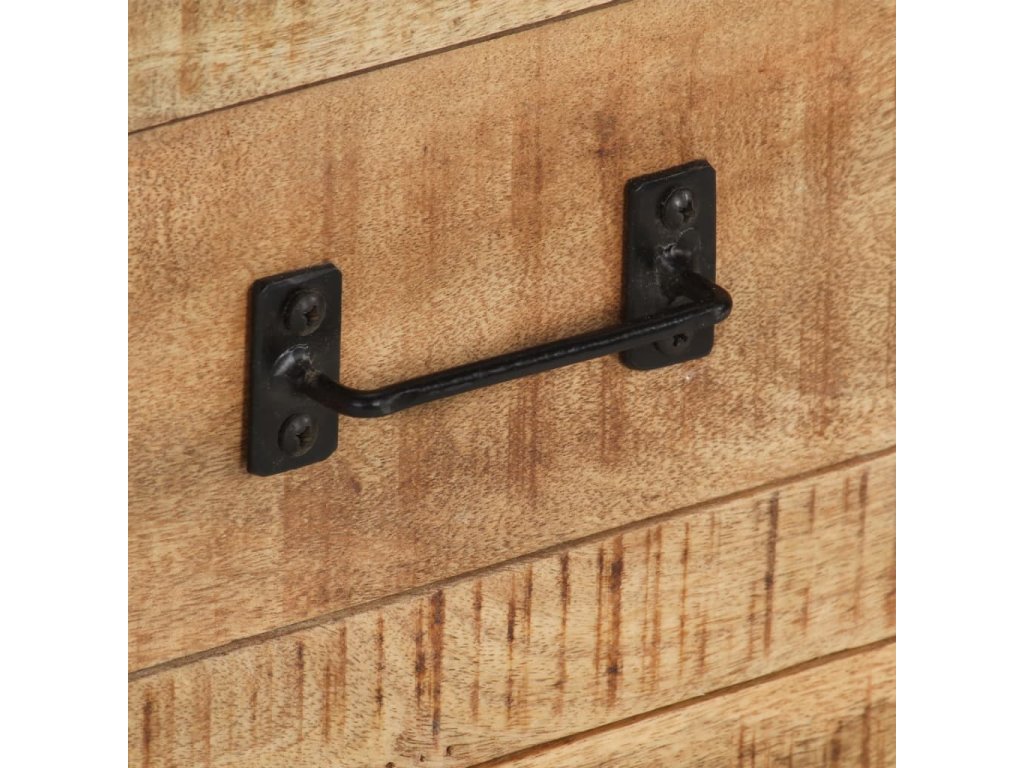 Úložná skrinka je ručne vyrobená z ocele a surového mangovníkového masívu, vďaka čomu je pevná a stabilná. Vďaka remeselnému spracovaniu a krásnej štruktúre dreva je každý kus tohto nábytku jedinečný a mierne odlišný od ostatných. Okrem toho má táto príručná skrinka dostatok úložného priestoru na úhľadné uloženie vašich potrieb na dosah.