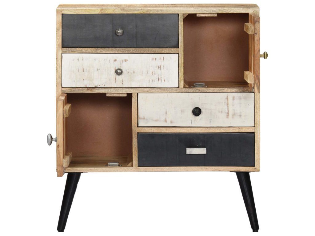 Komoda je vyrobená z masívneho mangovníkového dreva a vďaka lešteniu a lakovaniu dostala krásny povrch, čo jej dodalo rafinovaný vzhľad. Mangovníkové drevo je husté a pevné tvrdé drevo, ktoré má na svojom povrchu krásne hnedé a zlaté pruhy a kontúry. Má 4 zásuvky a 2 dvierka, ktoré poskytujú dostatok úložného priestoru na uloženie vašich kníh, časopisov a iných položiek. Komoda sa dá ľahko zmontovať a očistiť vlhkou handričkou.