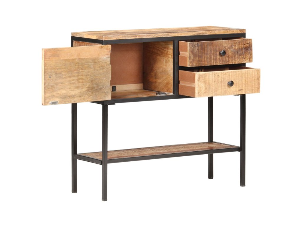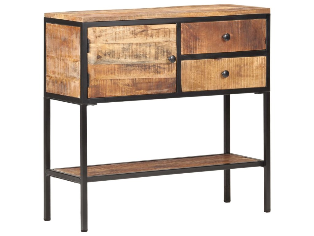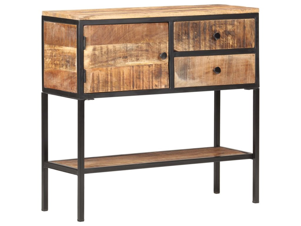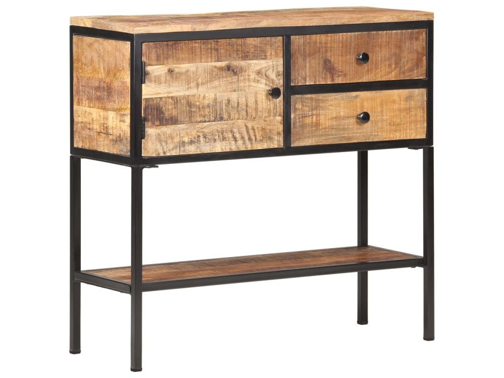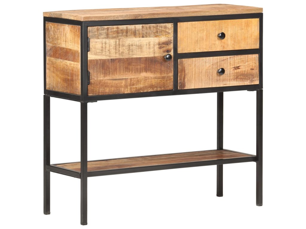 Príručná skrinka je vyrobená zo surového mangového dreva s prírodnou povrchovou úpravou, vďaka čomu je skutočne stabilná a trvácna. Mangový masív je drevo tropického listnatého stromu, ktoré je dostatočne pevné na to, aby unieslo aj značnú váhu, no zároveň odoláva každodennému opotrebovaniu. Vďaka remeselnému opracovaniu a krásnej textúre dreva je každý kus nábytku jedinečný a trochu odlišný od ostatných. Čierny železný rám s práškovou povrchovou úpravou jej prináša potrebnú stabilitu. Skrinka s jednými dvierkami, dvoma zásuvkami a poličkou v spodnej časti poskytuje množstvo úložného priestoru. Na pevnú vrchnú dosku si môžete vystaviť rôzne ozdobné predmety, ako napríklad rámiky s fotkami, kvety v kvetináči, vázy a podobne.