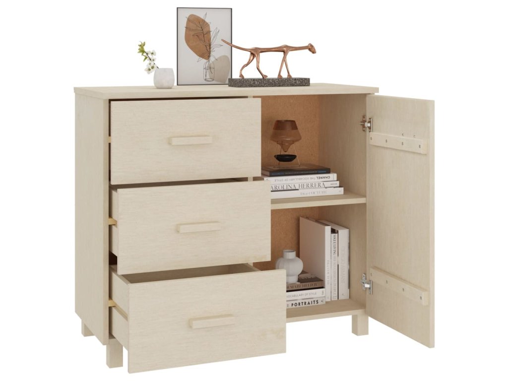 Skrinka so zásuvkami je vyrobená z borovicového masívu, vďaka čomu je stabilná a pevná. Komoda má 1 dvierka a 3 zásuvky, ktoré sa ľahko vysúvajú a poskytujú množstvo priestoru na prehľadné odkladanie bežných potrieb, ktoré tak budete mať vždy poruke. Robustná stolová doska je ako stvorená na vystavenie dekoratívnych predmetov, ako sú rámiky s fotkami či kvety v kvetináčoch.
