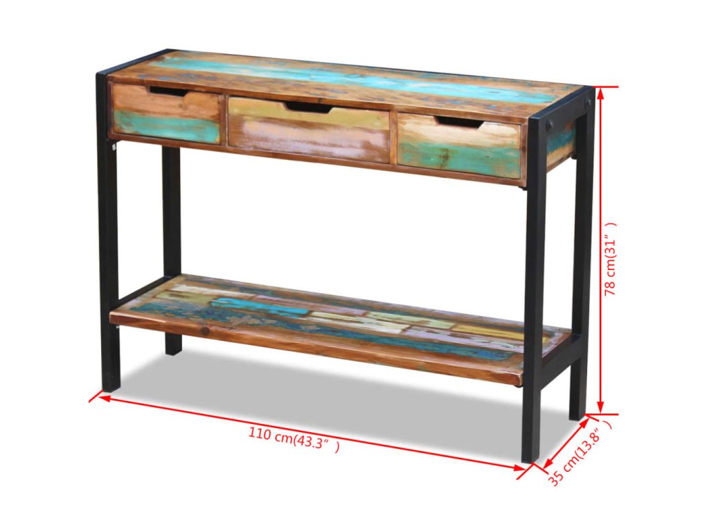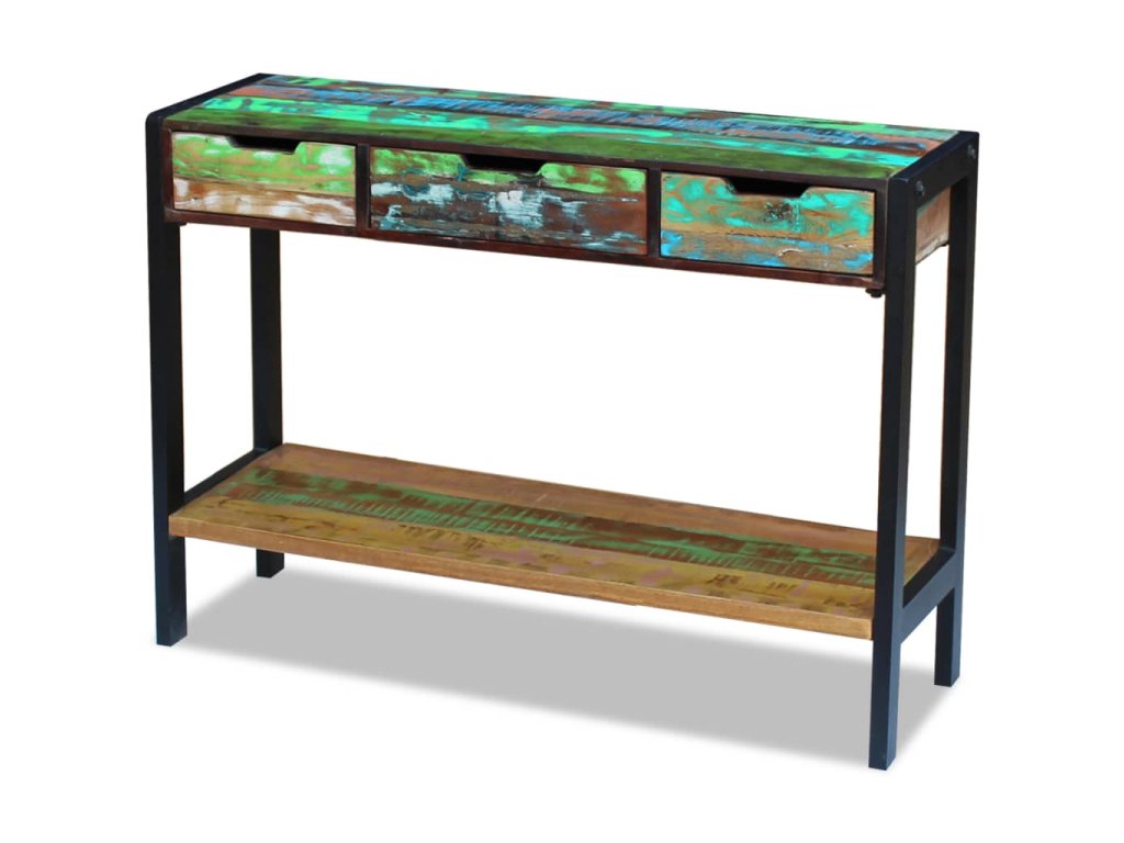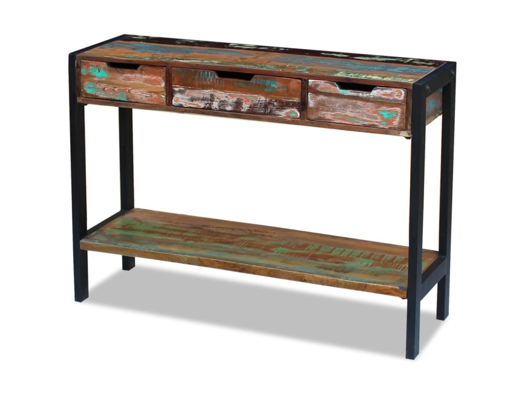 Drevená komoda vo vintage štýle je vyrobená z recyklovaného masívu a predstavuje nadčasový doplnok do domácnosti. Príručný stolík má pevný oceľový rám, takže je veľmi stabilný a trvácny. Stolová doska poskytuje pevné a spoľahlivé miesto, kam si môžete položiť nápoje, košíky s ovocím, vázy s kvetmi či iné ozdobné predmety. Má tri zásuvky, ktoré poskytujú množstvo priestoru na odkladanie menších predmetov, ako napríklad kľúčov, zápisníkov a iných drobností. Polička v spodnej časti ponúka ďalší úložný priestor, a tak budete mať vždy vo svojich veciach poriadok. Vysokú skrinku môžete využívať aj ako konzolový stolík, príručnú skrinku a podobne.