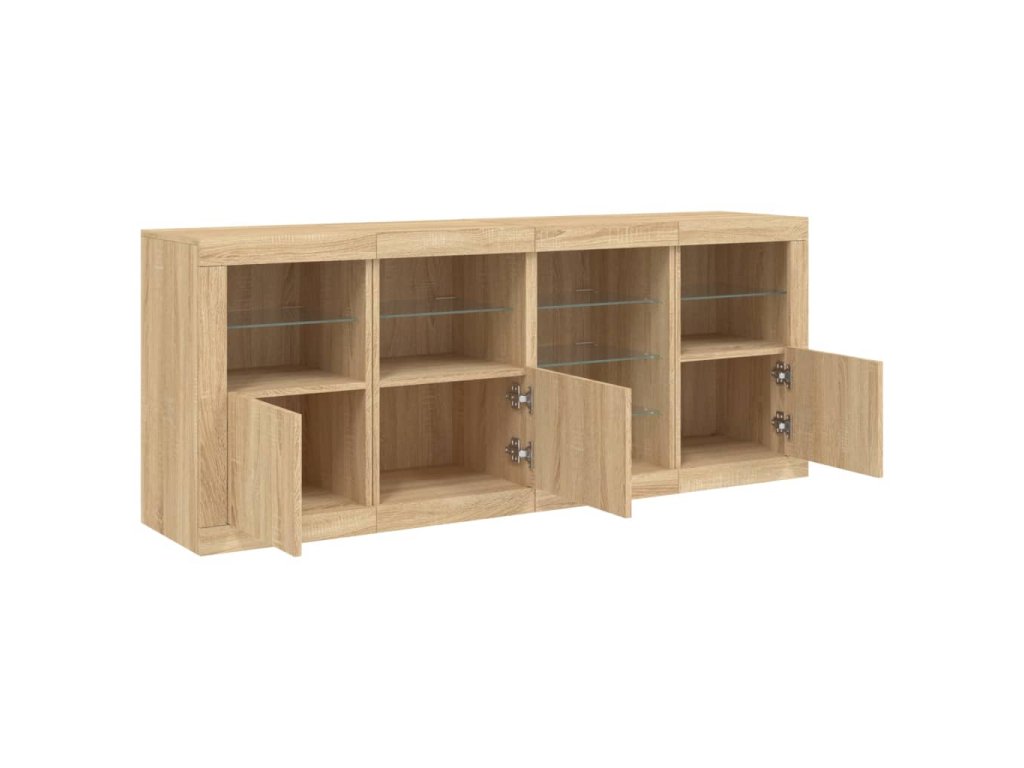 - RGB LED svetlá: Bufetová skrinka je vybavená žiarivými RGB LED svetlami. Vďaka rôznym nastaveniam môžete jednoducho zmeniť farbu svetiel a dokonca nastaviť aj ich automatické prispôsobenie. Tieto LED svetlá nielenže zvýrazňujú moderný vzhľad skrinky, ale prispievajú aj k jej módnemu vzhľadu.