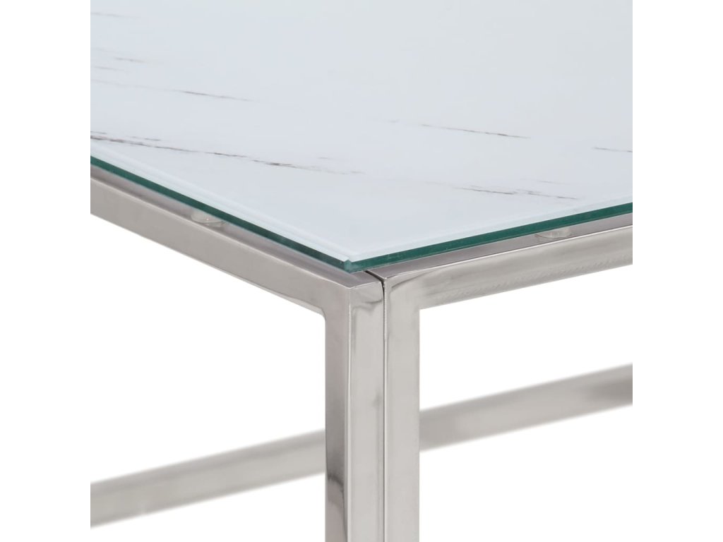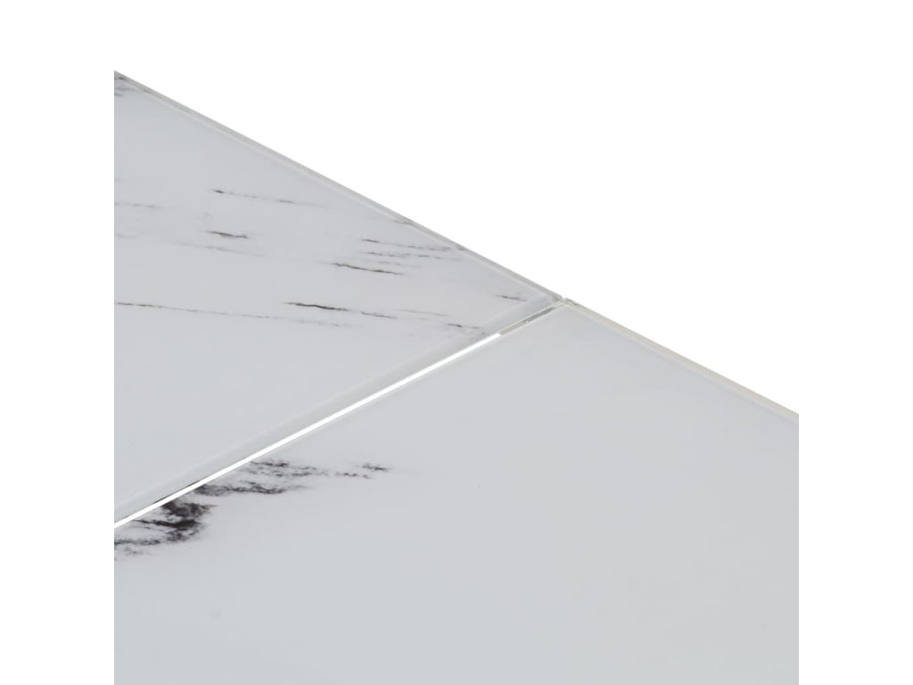 - Sklenená doska s povrchovou úpravou bieleho mramoru: Vrchná doska stolíka poskytuje bezpečnú a dostatočnú plochu na umiestnenie občerstvenia, nápojov, váz, misiek s ovocím alebo iných dekoratívnych predmetov.