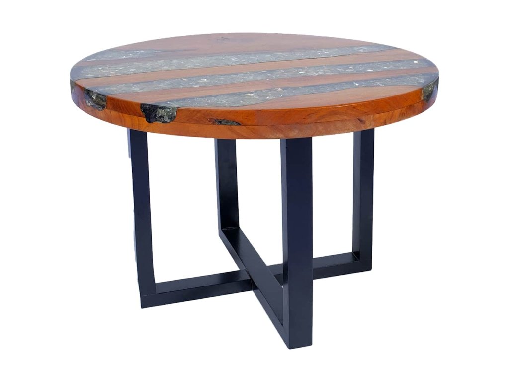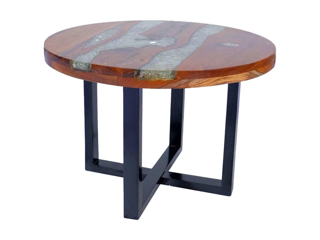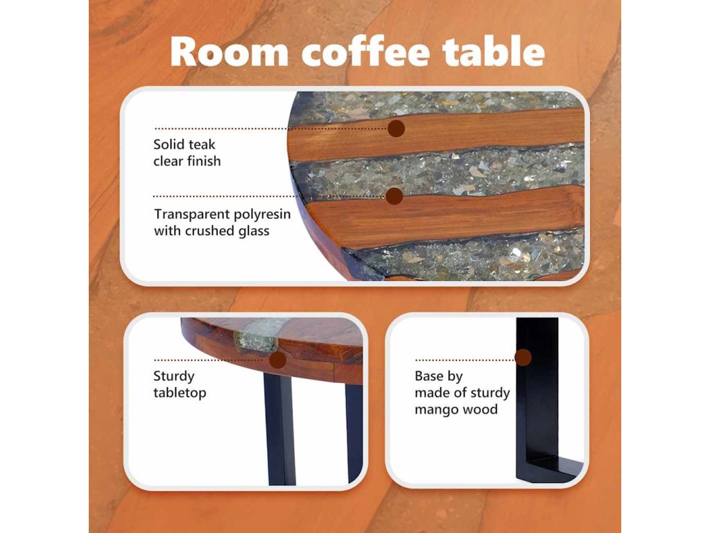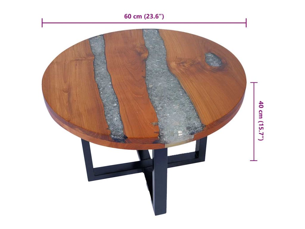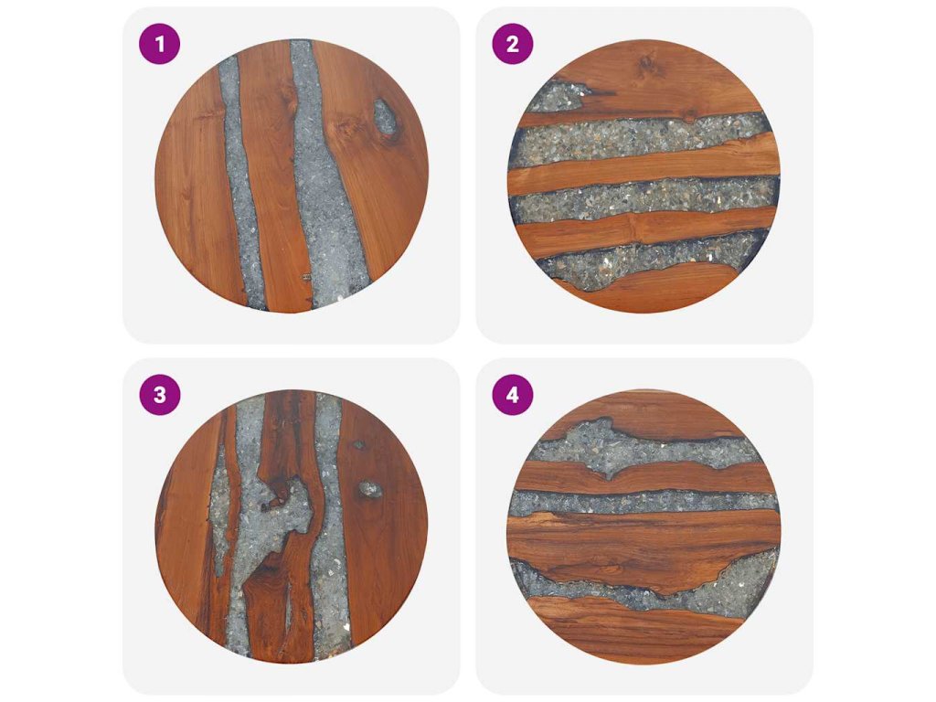 - Materiál stolovej dosky: Masívne teakové drevo s čírou lakovanou povrchovou úpravou + priehľadná živica s drveným sklom