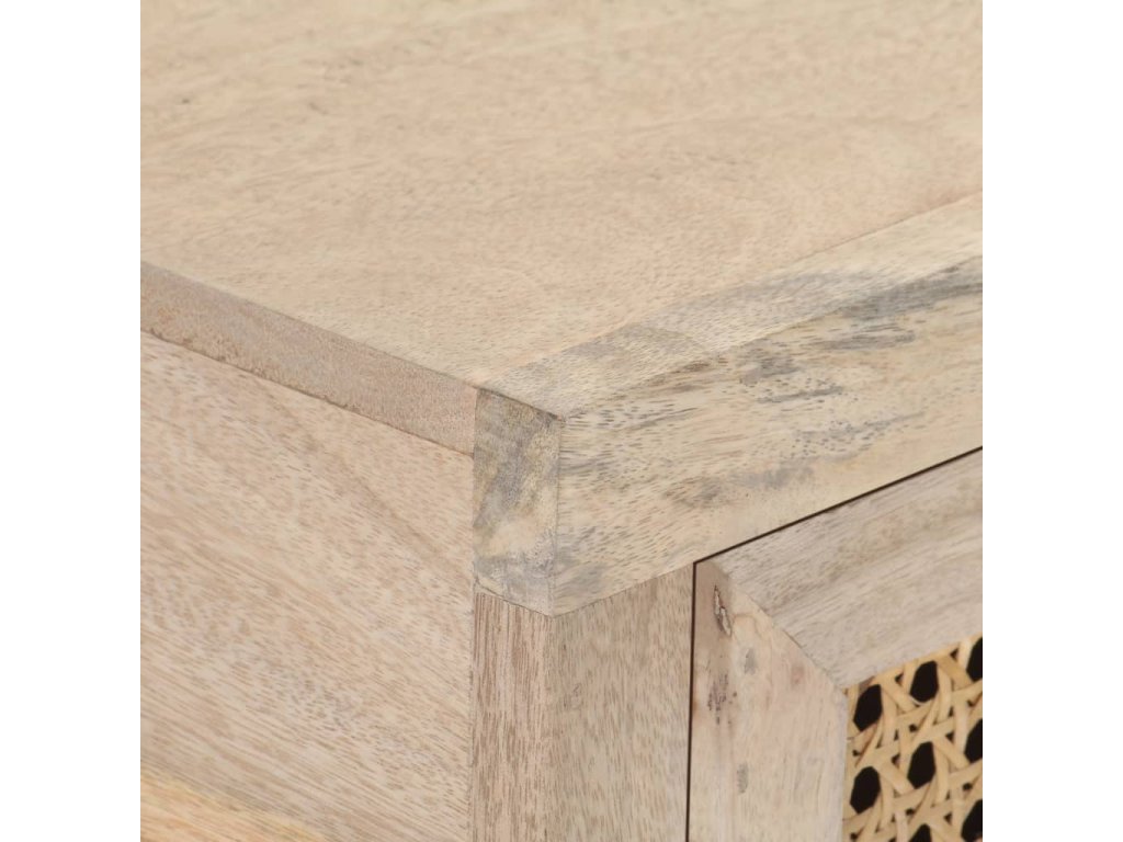 - Materiál: Masívne mangovníkové drevo s bieleným povrchom, prírodná trstina, práškovaná oceľ