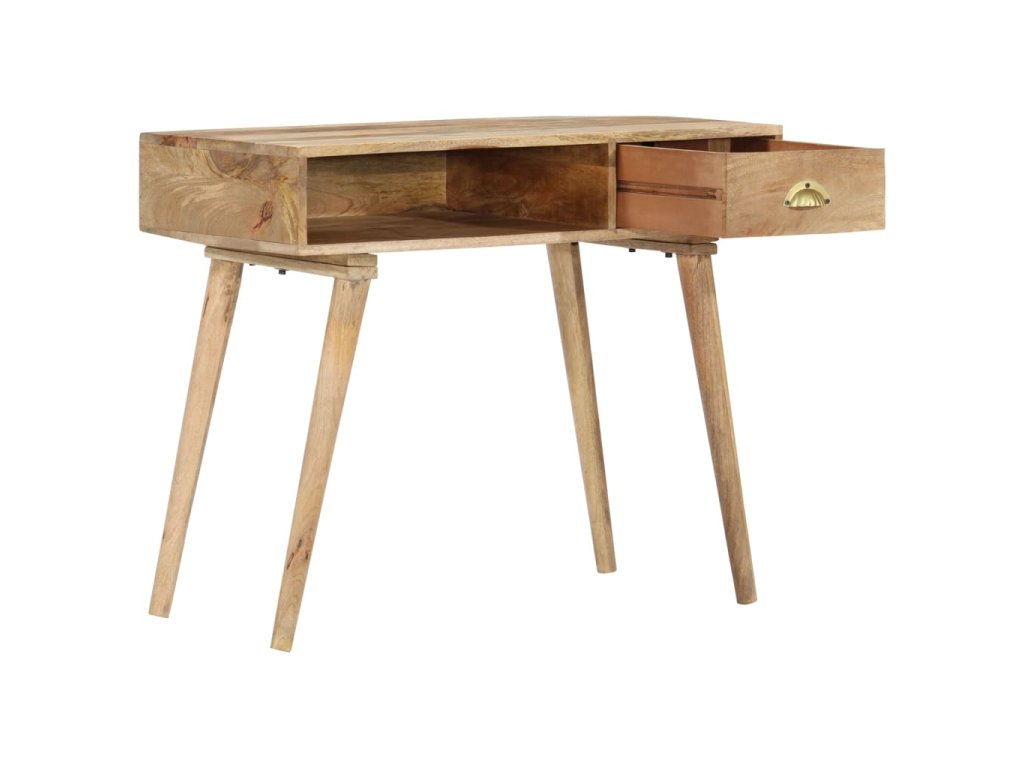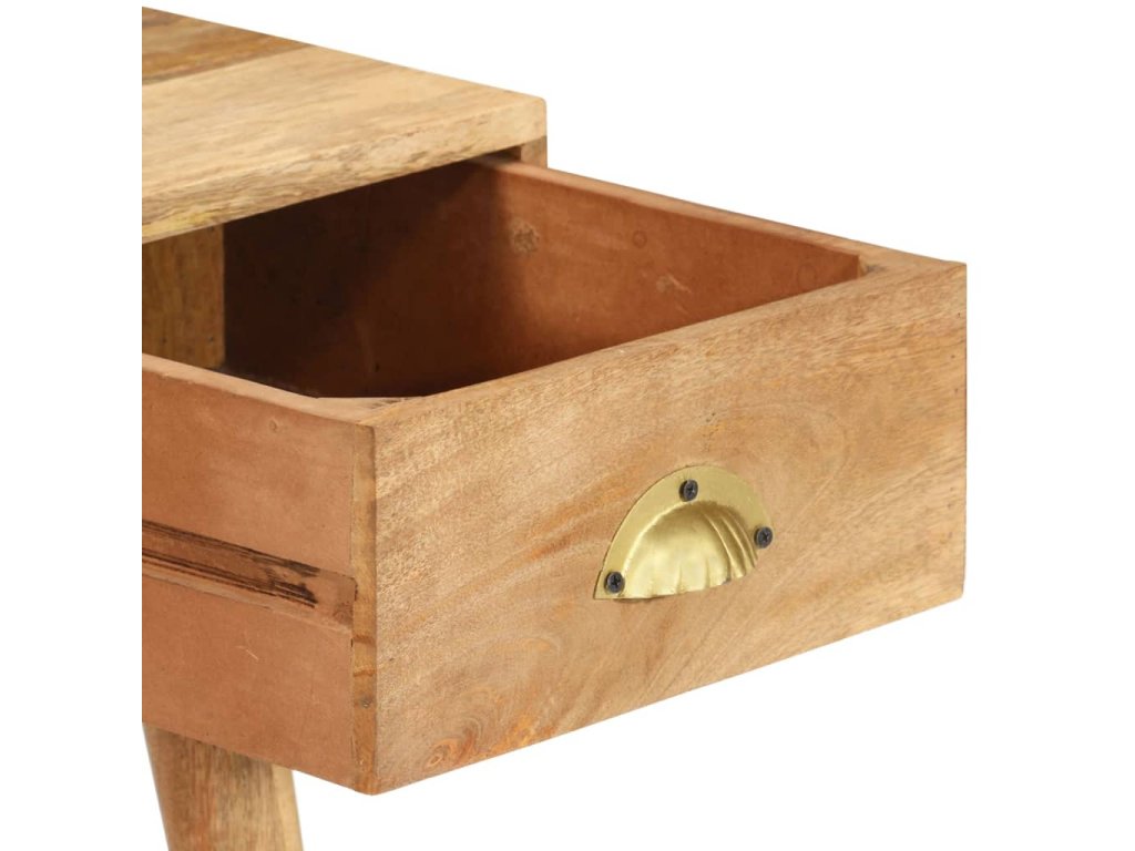 Stolík je vyrobený z masívneho mangovníkového dreva s prírodným povrchom, ktoré je trvácne a krásne. Každý krok procesu výroby sa vykonáva s najväčšou starostlivosťou, či už je to brúsenie alebo lakovanie. Stolík bol ručne vyrobený a vďaka krásnej štruktúre dreva je každý kus nábytku jedinečný a mierne sa odlišuje od iných kusov. Robustná stolová doska je ideálna na vystavenie dekoratívnych predmetov, fotorámikov alebo kvetináčov. Na uloženie malých predmetov, ako sú kľúče, poznámkové bloky, perá a ďalšie drobnosti, slúži zásuvka s hladkým vysúvaním a jeden otvorený priečinok. Ľahko sa čistí a udržiava vlhkou handričkou.
