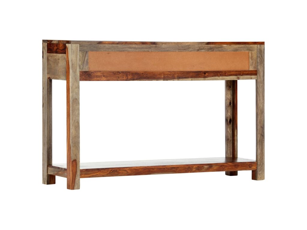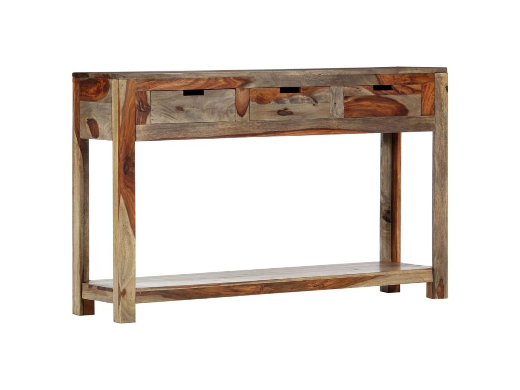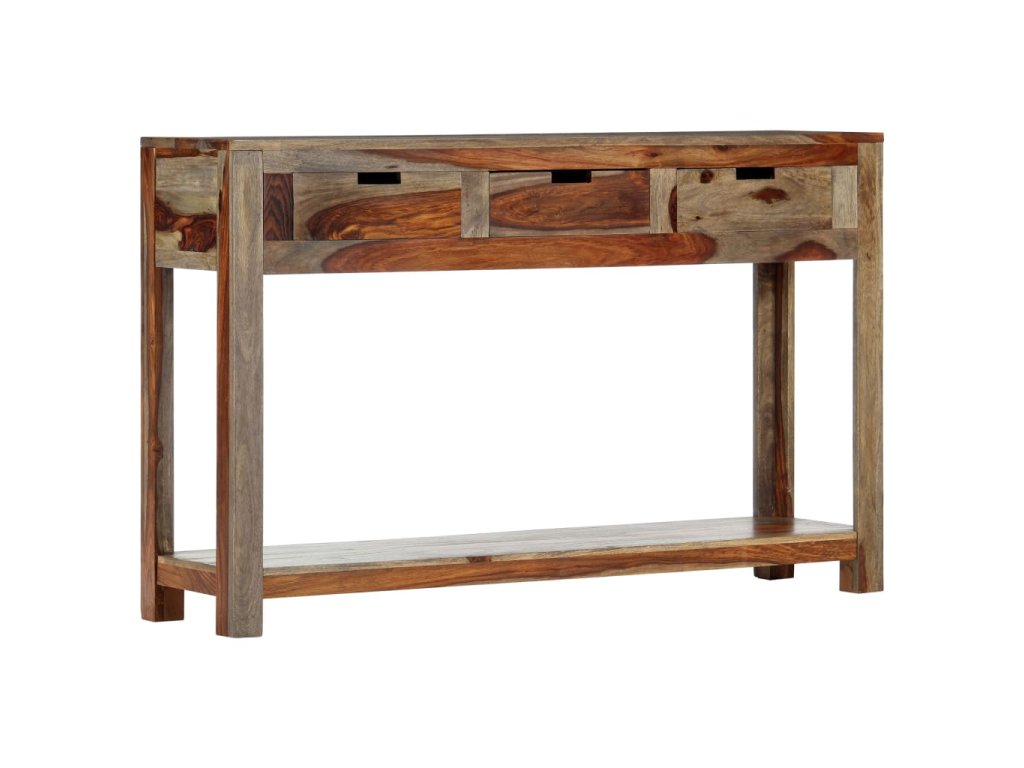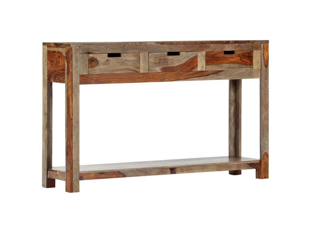 Tento konzolový stolík z dreveného masívu je štýlový a zároveň praktický. Môžete ho využívať aj ako komodu, vysokú skrinku či konzolovú skrinku. Má elegantný dizajn, a tak sa určite stane stredobodom miestnosti. Konzolový stolík má pevnú dosku, na ktorú môžete umiestniť dekoratívne predmety, ako sú košíky s ovocím alebo vázy. 3 veľké zásuvky a polica v spodnej časti poskytujú ďalší úložný priestor na menšie predmety, napríklad kľúče, DVD, zápisníky, perá a iné drobnosti. Polička v spodnej časti sa postará o to, aby ste vo veciach mali poriadok.