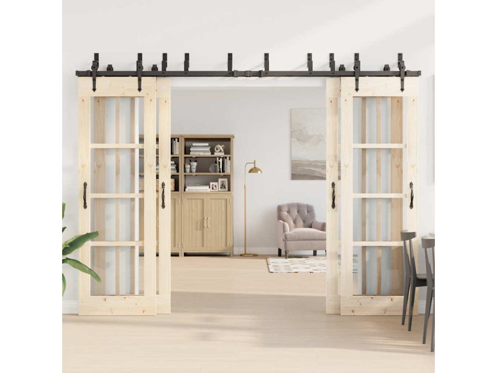 S touto súpravou kovania na posuvné dvere môžete jednoducho nastaviť dvojité koľajnice pre pár dverí, ktoré sa budú posúvať pred sebou a za sebou.