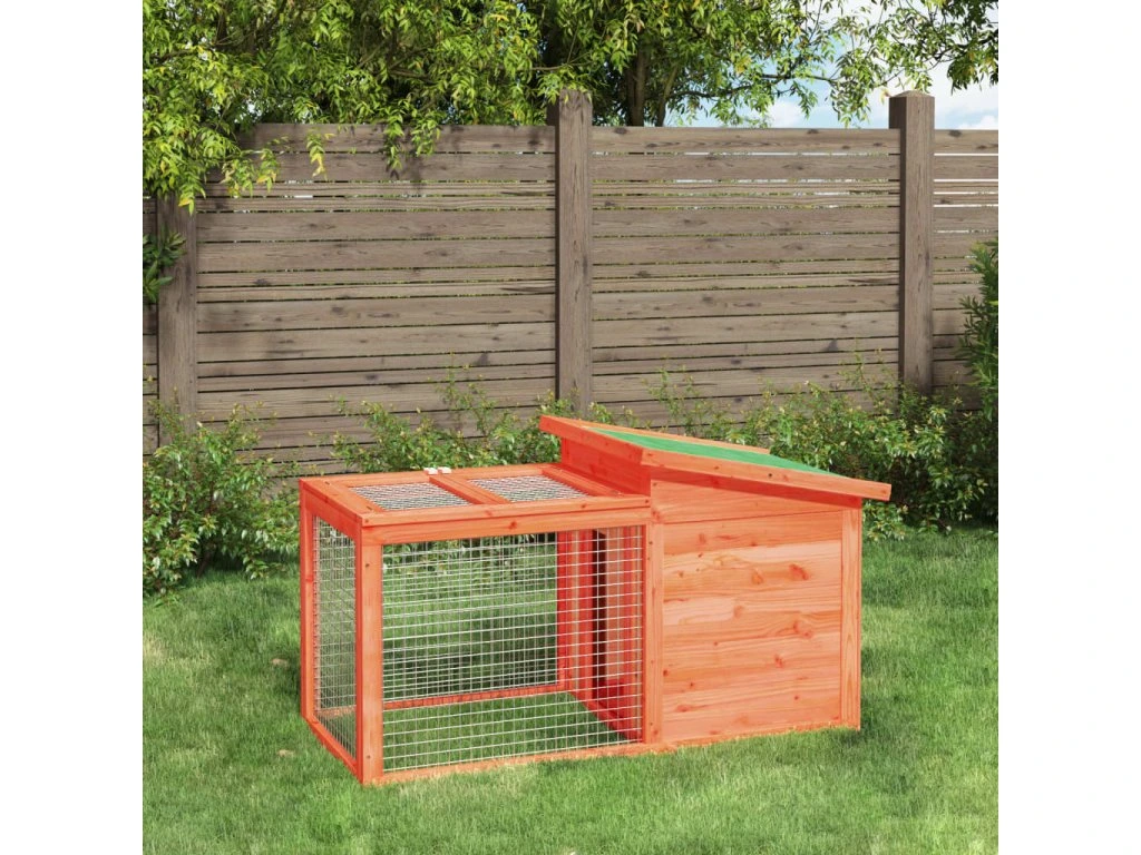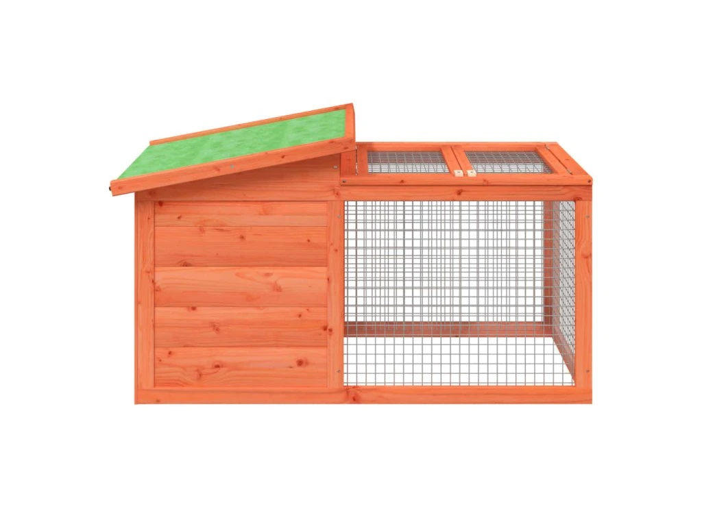 - Pevná konštrukcia: Táto vonkajšia králikáreň je vyrobená z masívneho borovicového dreva, čo prispieva k pevnej konštrukcii. Borovicové drevo je krásny prírodný materiál. Má rovnú kresbu a nachádzajú sa na ňom hrče, ktoré tomuto materiálu dodávajú charakteristický rustikálny vzhľad. Vďaka vode odolnej streche je klietka pre králiky ideálna na vonkajšie použitie.