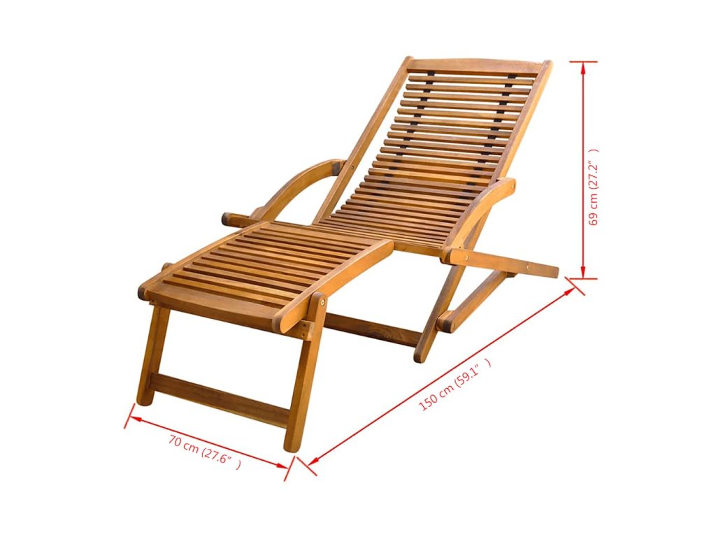 Ležadlo je vyrobené z vysokokvalitného akáciového dreva, tropického tvrdého dreva, ktoré je odolné voči poveternostným vplyvom a veľmi trvácne. Nohy si môžete položiť na pohodlnú opierku. Kreslo na terasu sa dá poskladať, keď sa nepoužíva.