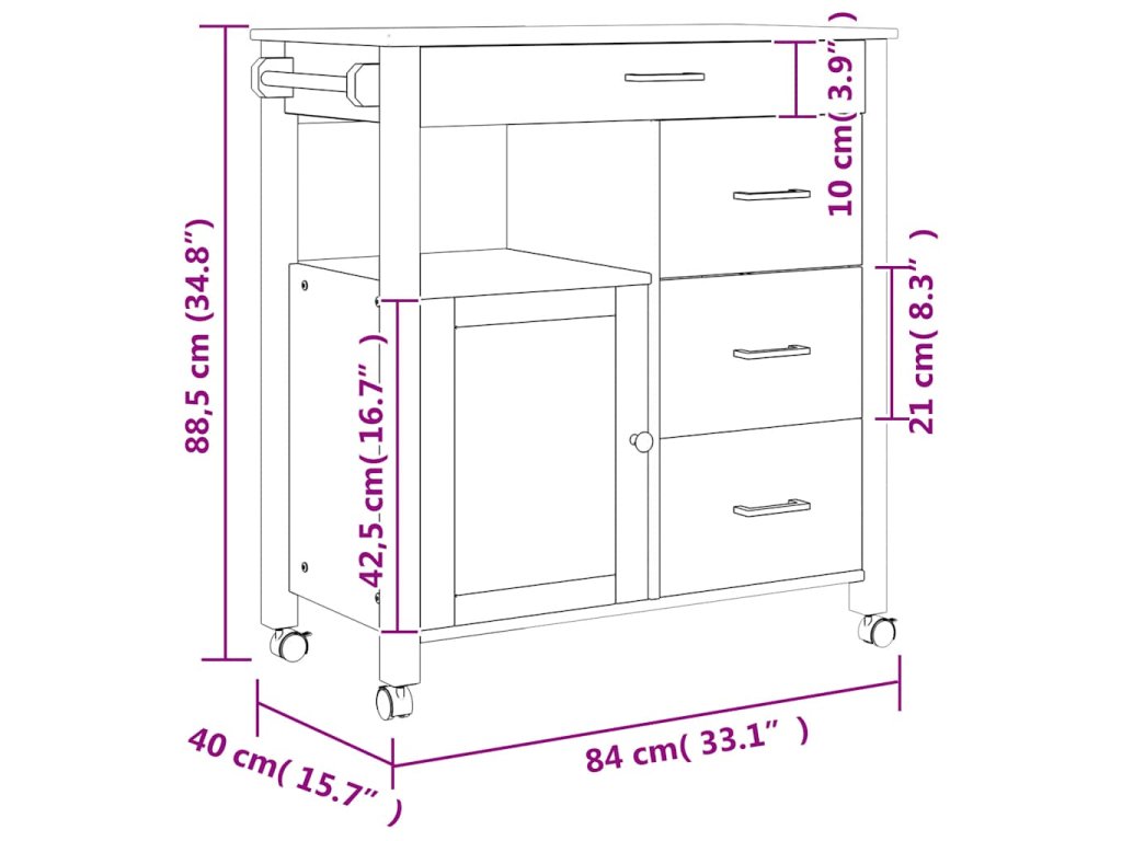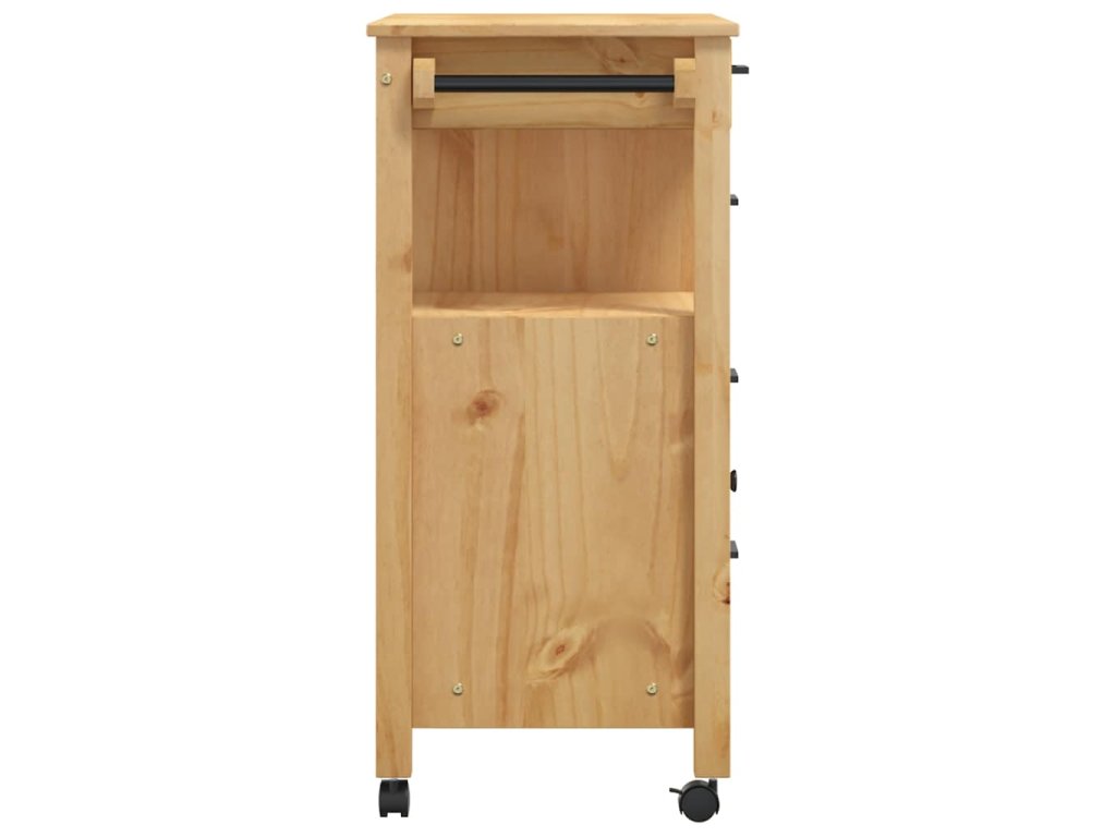 - Trvácny rám: Masívne borovicové drevo je krásny prírodný materiál. Borovicové drevo má rovnú kresbu a nachádzajú sa na ňom uzly, ktoré tomuto materiálu dodávajú charakteristický rustikálny vzhľad. Tento kuchynský úložný vozík je vyrobený z masívneho borovicového dreva, a je odolný a robustný.