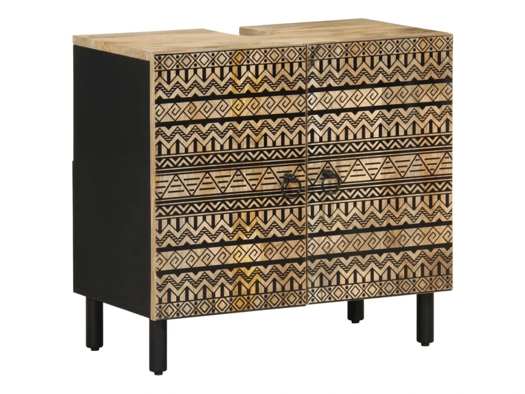 - Mangový masív: Mangový masív je pevné drevo tropického listnatého stromu, z ktorého sa vyrába robustný nábytok. Vďaka krásnej textúre dreva je každý kus nábytku trochu odlišný od ostatných. Skrinka pod umývadlo je vyrobená z mangového masívu, vďaka čomu je trvácna a stabilná.