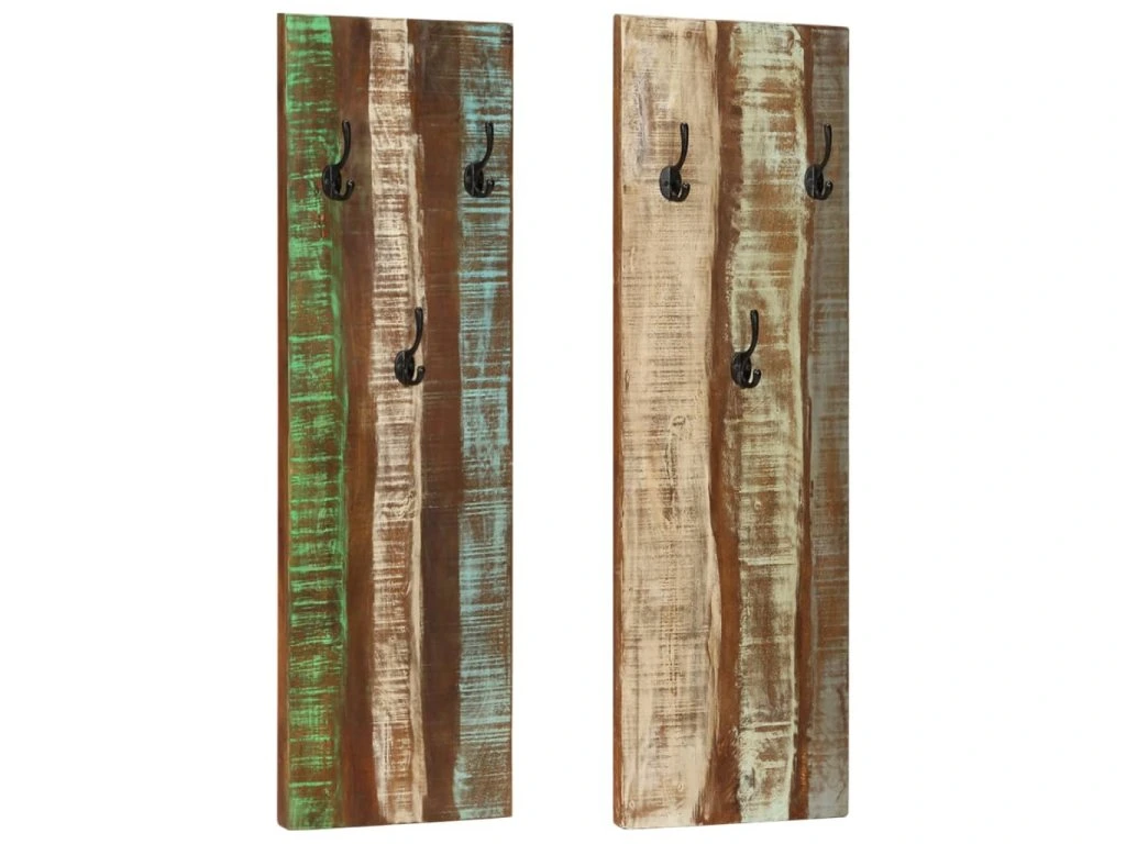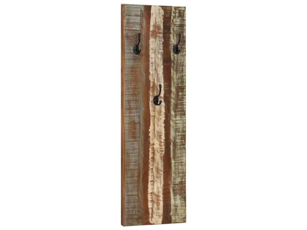 Vešiak je vyrobený z masívneho recyklovaného dreva. Je kombináciou recyklovaných drevín vrátane teakového, mangovníkového, borovicového, bukového dreva a podobne. Tieto drevá sú recyklované zo starých budov ako sú továrne, kôlne alebo z lodí. To z neho robí fantastickú možnosť šetrnú k životnému prostrediu pri výrobe nábytku. Keďže je každý kus ručne vyrobený, farby sa líšia a objavuje sa mnoho modrých, zelených, krémových a niekedy aj pomarančových, červených a ružových odtieňov. To znamená, že každý z nich je jedinečný! Každý vešiak je vybavený 3 háčikmi na zavesenie tašiek, kabátov, dáždnikov, príveskov, kľúčov a podobne, čím výrazne ušetríte miesto v izbe. Súpravu je možné jednoducho namontovať na stenu.