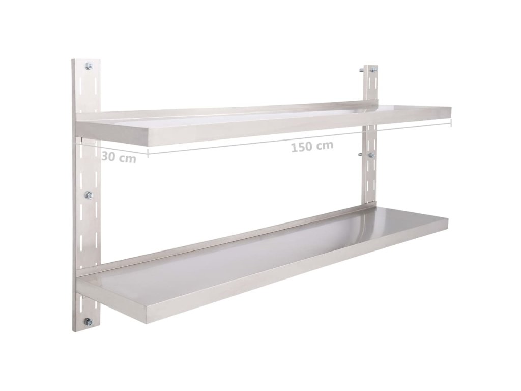 Náš nástenný regál s 2 policami z nehrdzavejúcej ocele je nielen štýlový, ale aj veľmi funkčný, čo bude skvelou voľbou pre tých, ktorí potrebujú viac úložného priestoru v kuchyni. Slúži ako ideálne miesto na uchovávanie tanierov, riadov a rôznych iných kuchynských potrieb.