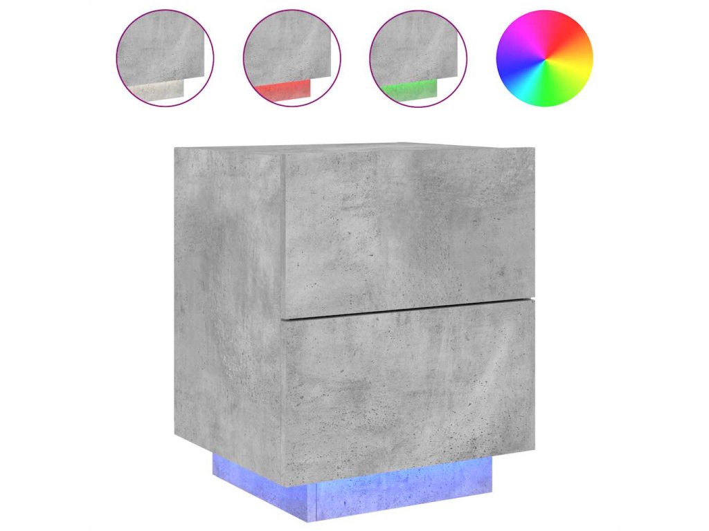 - RGB LED svetlá: Skrinka je vybavená žiarivými RGB LED svetlami. Vďaka rôznym nastaveniam môžete jednoducho zmeniť farbu svetiel a dokonca nastaviť aj ich automatické prispôsobenie. Tieto LED svetlá nielenže zvýrazňujú moderný vzhľad nočného stolíka, ale taktiež ho aj zatraktívňujú.
