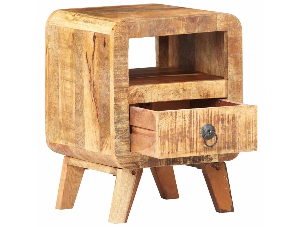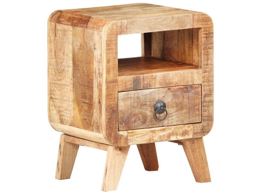 Tento nočný stolík je vyrobený zo surového mangovníkového dreva, tvrdého dreva, ktoré je dostatočne pevné, aby unieslo aj vyššiu záťaž. Obstojí tiež opotrebovanie časom. Drevo má nádhernú hustú kresbu a každý kus nábytku je jedinečný a odlišný od ostatných kusov. Pevná doska je ideálna na umiestnenie nočnej lampy, telefónu, budíka a iných drobných predmetov, alebo len na vystavenie zarámovaných fotografií alebo iných dekoratívnych predmetov. Zásuvka tiež poskytuje dostatočné miesto na uloženie vecí na dosah.