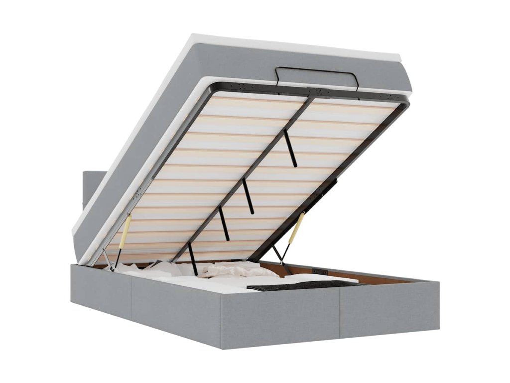 - Veľký úložný priestor pod posteľou: Vďaka hydraulickému zdvíhaciemu mechanizmu ponúka rám postele dostatok úložného priestoru pod posteľou, čím sa maximalizuje priestor bez toho, aby zaberal ďalšiu podlahovú plochu. Jednoduchým potiahnutím rukoväte sa lamelová základňa hladko zdvihne, čo vám umožní získať veci rýchlo a bez námahy.