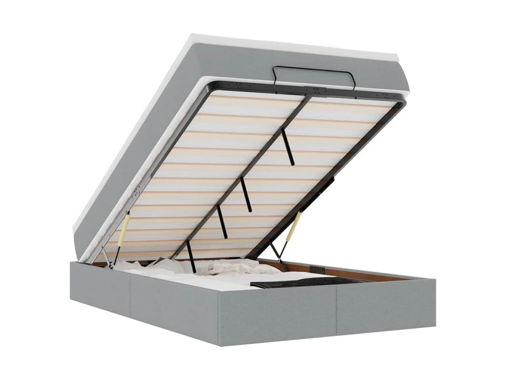 - Veľký úložný priestor pod posteľou: Vďaka hydraulickému zdvíhaciemu mechanizmu ponúka rám postele dostatok úložného priestoru pod posteľou, čím sa maximalizuje priestor bez toho, aby zaberal ďalšiu podlahovú plochu. Jednoduchým potiahnutím rukoväte sa lamelová základňa hladko zdvihne, čo vám umožní získať veci rýchlo a bez námahy.