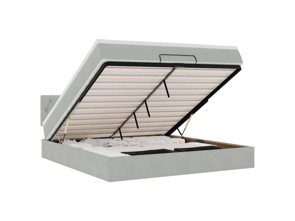 - Veľký úložný priestor pod posteľou: Vďaka hydraulickému zdvíhaciemu mechanizmu ponúka rám postele dostatok úložného priestoru pod posteľou, čím sa maximalizuje priestor bez toho, aby zaberal ďalšiu podlahovú plochu. Jednoduchým potiahnutím rukoväte sa lamelová základňa hladko zdvihne, čo vám umožní získať veci rýchlo a bez námahy.