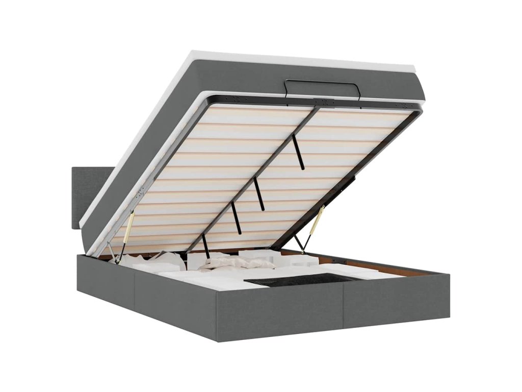 - Veľký úložný priestor pod posteľou: Vďaka hydraulickému zdvíhaciemu mechanizmu ponúka rám postele dostatok úložného priestoru pod posteľou, čím sa maximalizuje priestor bez toho, aby zaberal ďalšiu podlahovú plochu. Jednoduchým potiahnutím rukoväte sa lamelová základňa hladko zdvihne, čo vám umožní získať veci rýchlo a bez námahy.