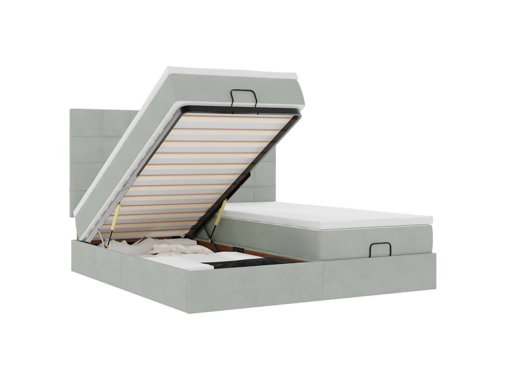 - Veľký úložný priestor pod posteľou: Vďaka hydraulickému zdvíhaciemu mechanizmu ponúka rám postele dostatok úložného priestoru pod posteľou, čím sa maximalizuje priestor bez toho, aby zaberal ďalšiu podlahovú plochu. Jednoduchým potiahnutím rukoväte sa lamelová základňa hladko zdvihne, čo vám umožní získať veci rýchlo a bez námahy.