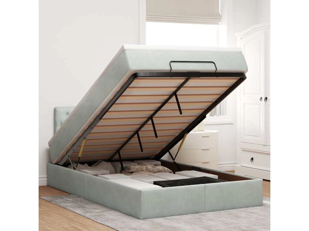 - Veľký úložný priestor pod posteľou: Vďaka hydraulickému zdvíhaciemu mechanizmu ponúka rám postele dostatok úložného priestoru pod posteľou, čím sa maximalizuje priestor bez toho, aby zaberal ďalšiu podlahovú plochu. Jednoduchým potiahnutím rukoväte sa lamelová základňa hladko zdvihne, čo vám umožní získať veci rýchlo a bez námahy.