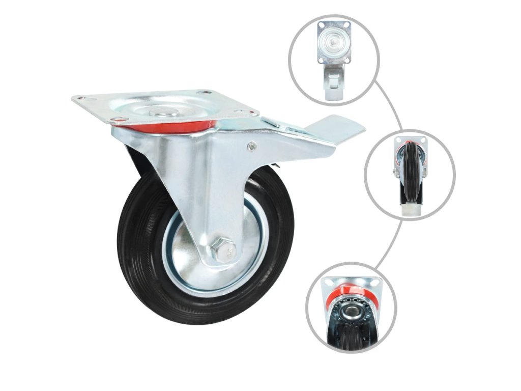 Kolieska sú vyrobené z gumy, ktorá sa vyznačuje dobrou odolnosťou voči nárazom a vibráciám, vďaka čomu sa kolieska budú pohybovať plynule a ticho. Kolieska majú mäkký povrch, aby nepoškrabali podlahu. Pozinkovaný železný rám je mimoriadne odolný voči korózii a kolieskam dodáva potrebnú pevnosť a trvácnosť. Otočné kolieska sú vybavené brzdami pre flexibilnejšie ovládanie. Každé koliesko má maximálnu nosnosť 150 kg.