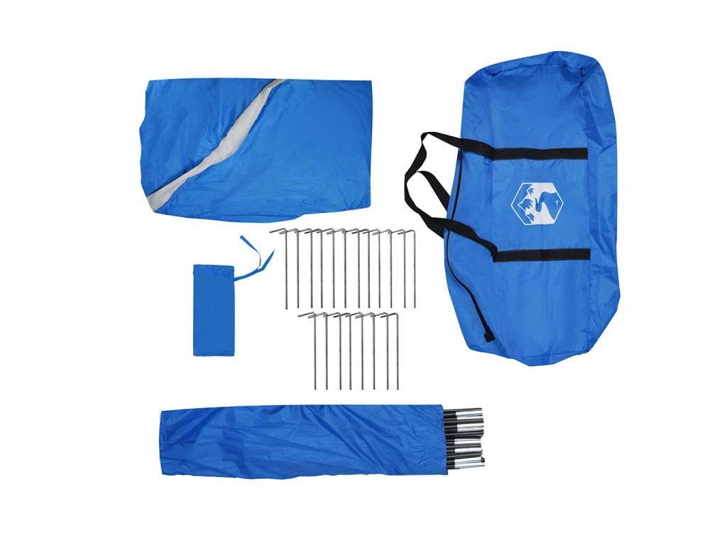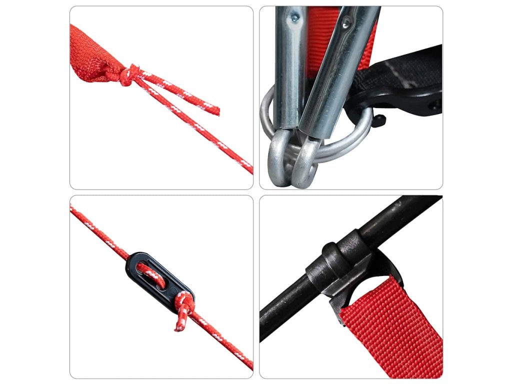 - Jednoduché nastavenie a demontáž: Vďaka veľmi flexibilným a ľahkým tyčiam zo sklenených vlákien a pohodlnému systému spojenia kolíkom a krúžkom je postavenie a zloženie stanu hračkou.