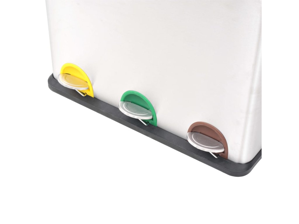 Pomocou pedálov môžete veká jednoducho otvoriť alebo zatvoriť. Pedále sú farebne označené, čo vám uľahčí triedenie odpadu. Odpadkový kôš na triedený odpad má kryt z nerezovej ocele s matným povrchom, ktorý mu dodáva elegantný vzhľad. Vnútorné nádoby, veká a základňa sú vyrobené z trvácneho polypropylénu (PP). Veká s pomalým uzatváraním sa potichu otvárajú a zatvárajú. Keď sú veká uzatvorené, nepreniká von žiaden zápach. Každá vnútorná nádoba má veľkú rukoväť a dá sa ľahko vybrať von.