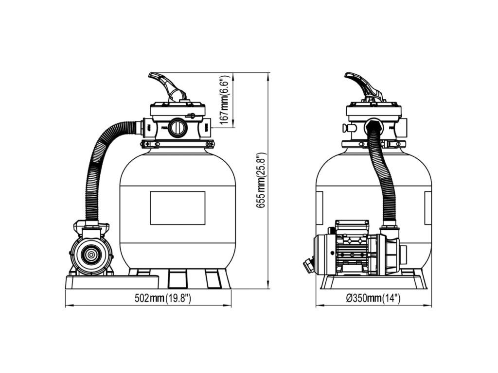 Pieskový filter dokáže prefiltrovať až 17000 litrov za hodinu. Má trvácnu filtračnú nádrž, ktorá je odolná voči korózii a voči pôsobeniu kyslej chlorovanej vody v bazéne. Je vybavený aj dodatočným predfiltrom, vďaka ktorému sa do pieskového filtra nedostanú väčšie nečistoty. Jeho súčasťou je viaccestný ventil pre jednoduché ovládanie a ľahko čitateľný manometer. Konštrukcia vrchnej prírubovej svorky umožňuje rotáciu v rozsahu 360 stupňov pre bezproblémovú inštaláciu. Súčasťou sady je aj upevniteľná základňa pre bezpečné a pevné uchytenie.