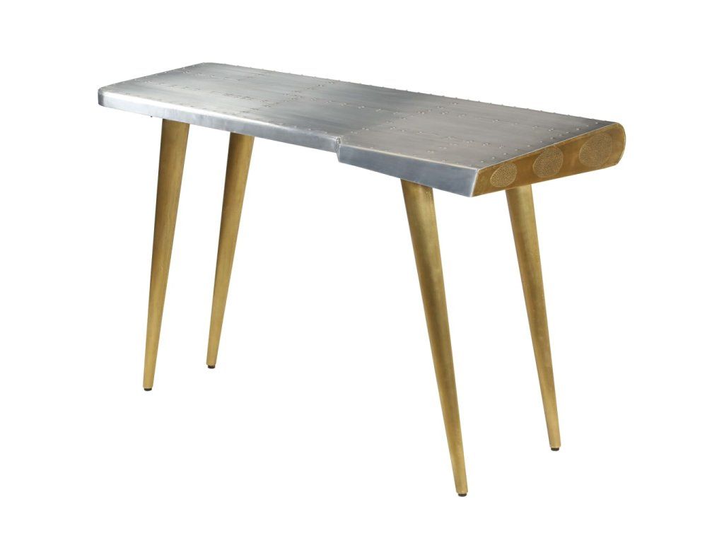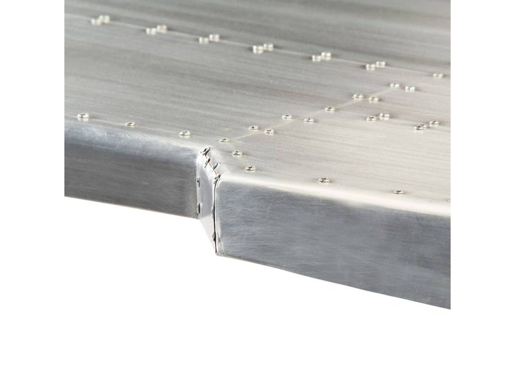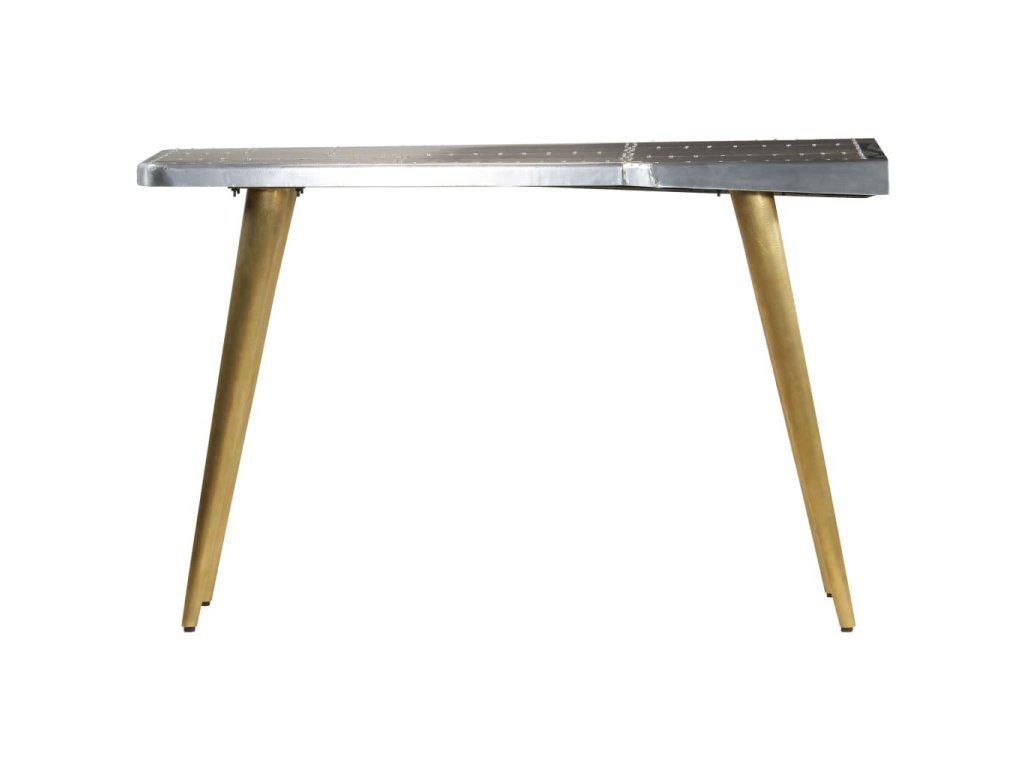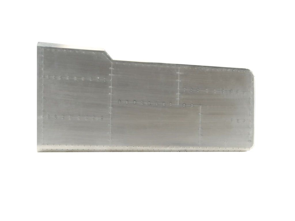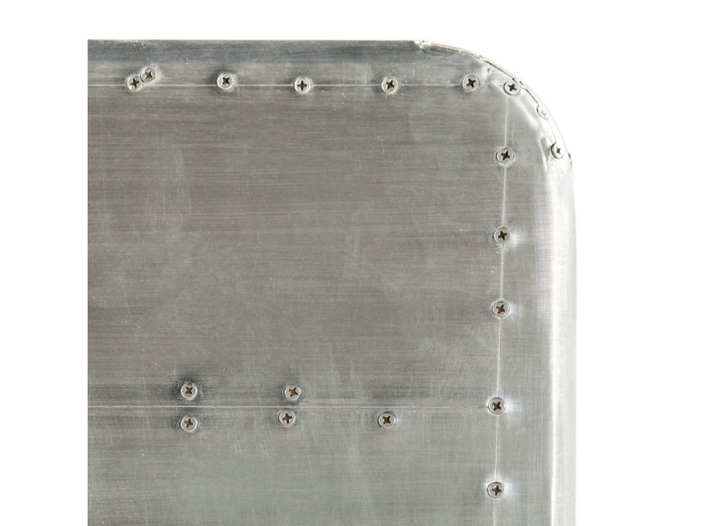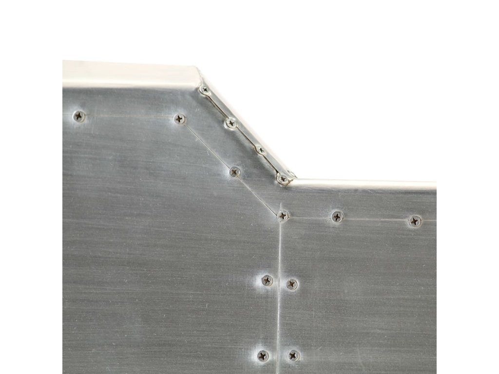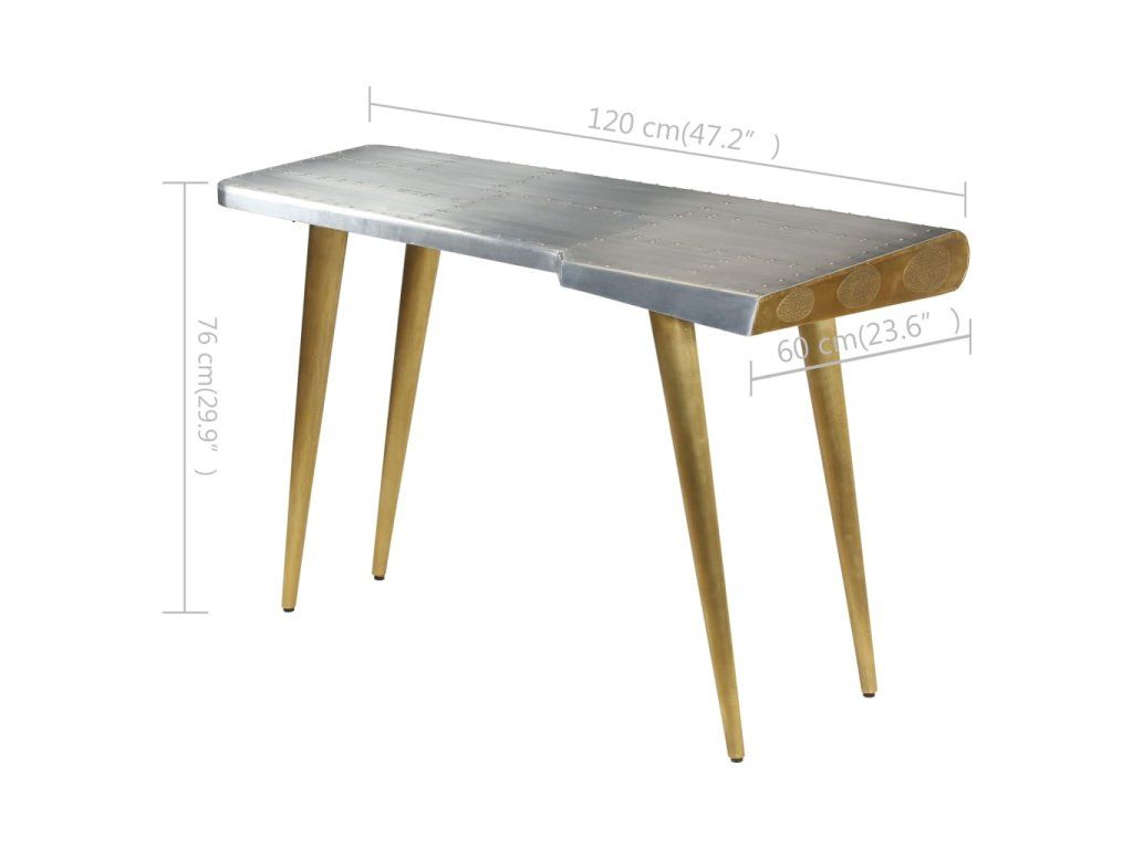 Pracovný stôl v leteckom štýle je vyrobený z masívneho mangovníkového dreva a jeho povrch je obložený leštenými hliníkovými panelmi v štýle patchwork, ktoré sú zvýraznené exponovanými oceľovými skrutkami, vďaka čomu je extrémne trvácny. Oceľové nohy v mosadznej farbe a vzorované nity dodávajú stolu priemyselný vzhľad. Má veľkú dosku, ktorá poskytuje dostatok priestoru na umiestnenie vašich šanónov, dokumentov, kníh alebo iných vecí.