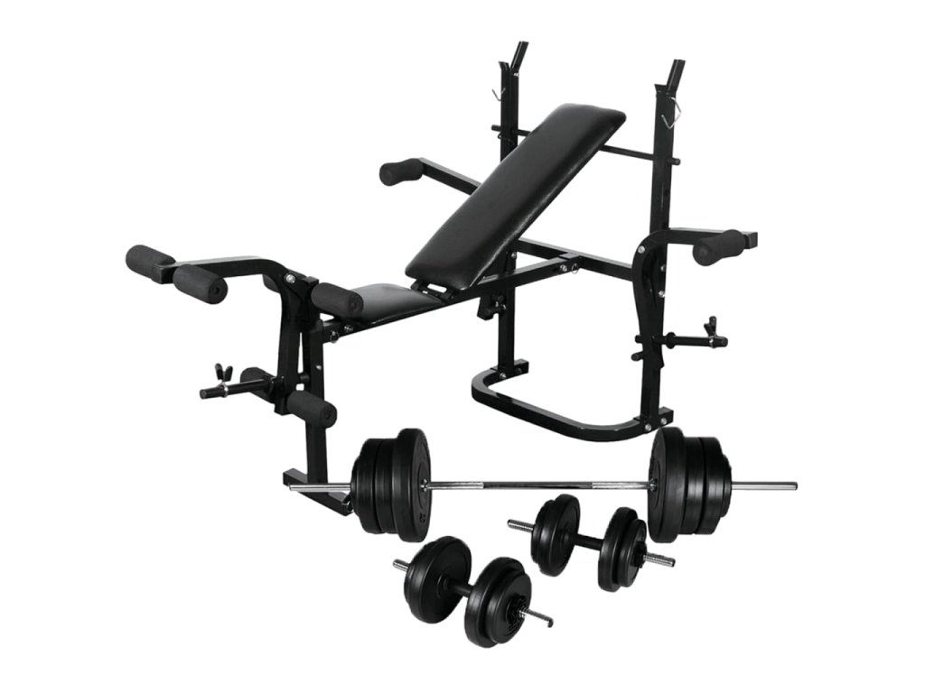 Multidom Posilňovacia lavica+stojan na závažia a sada činiek 60,5 kg