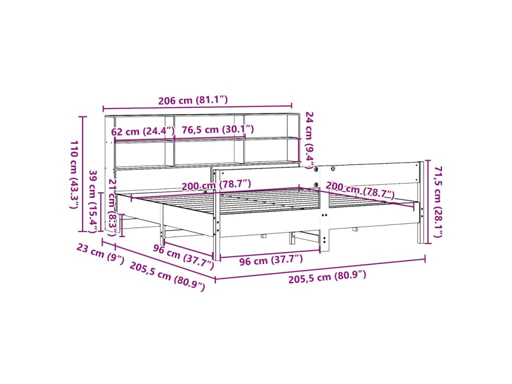 Multidom Posteľ s knižnicou bez matraca vosková 200x200 cm borovica