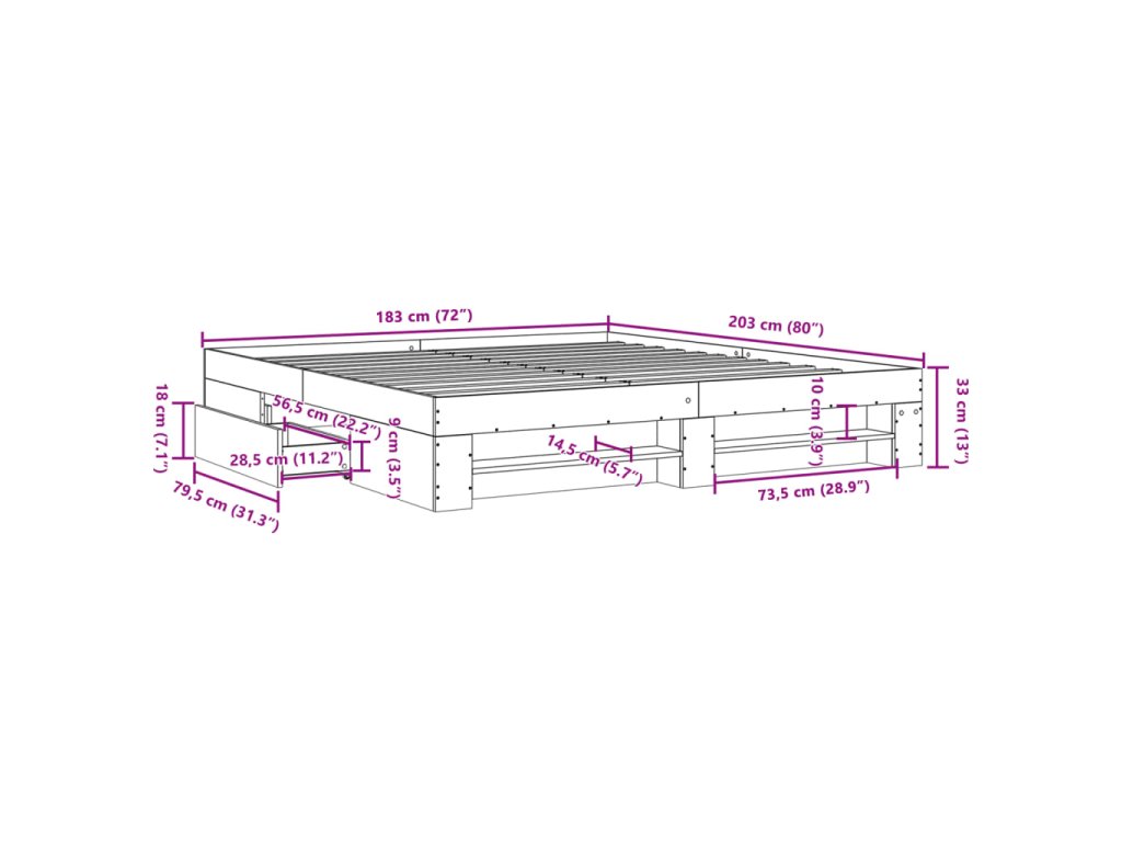 - Funkcia skladovania: Tento rám postele ponúka zásuvky a otvorené priehradky na prehľadné uloženie časopisov, kníh, hračiek a iných drobných predmetov.